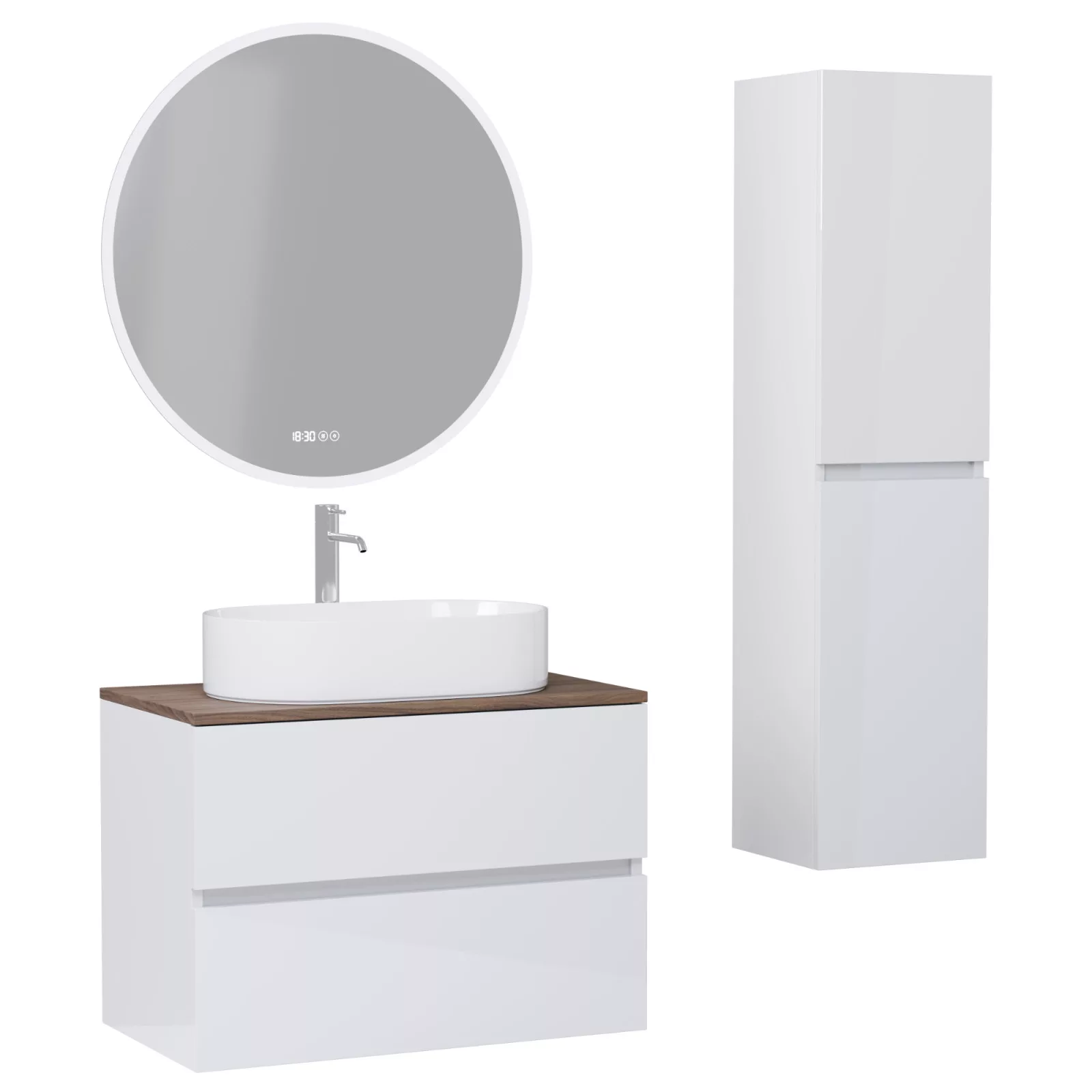HD Zyra Lacquer White 80 komplett fürdőszoba bútor szett fali mosdószekrénnyel, tölgyfa színű mosdópulttal, tükörrel és magasszekrénnyel
