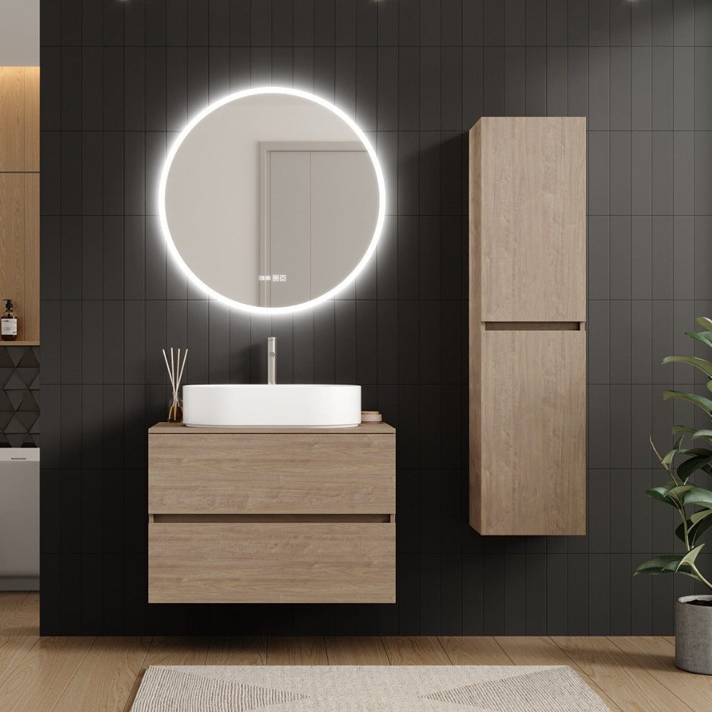 Saját márkás 80 cm széles fali mosdószekrény tölgyfa színben, füst szürke mosdópulttal, rejtett fióksínnel és önbehúzos technológiával ellátott.