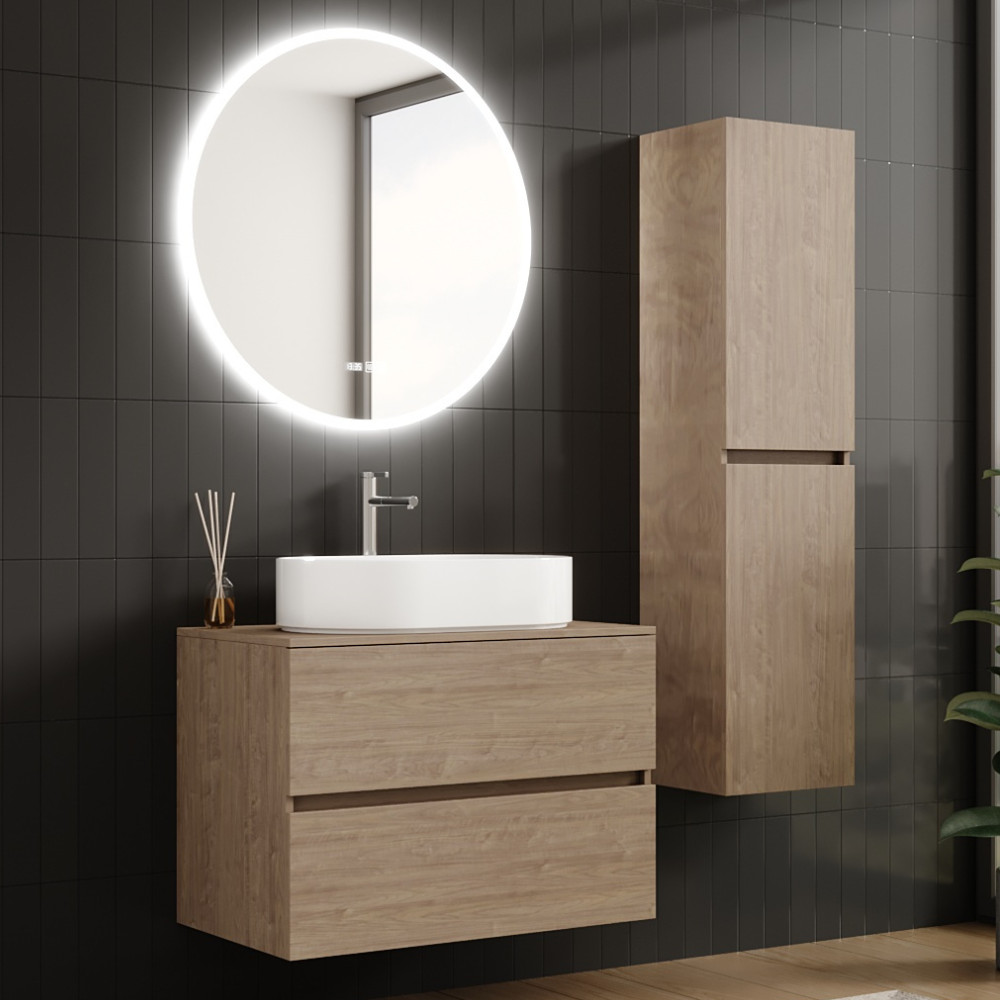 Saját márkás 80 cm széles komplett fürdőszoba bútor fali mosdószekrénnyel tölgyfa színben, tölgyfa színű mosdópulttal és fali okos LED tükörrel.