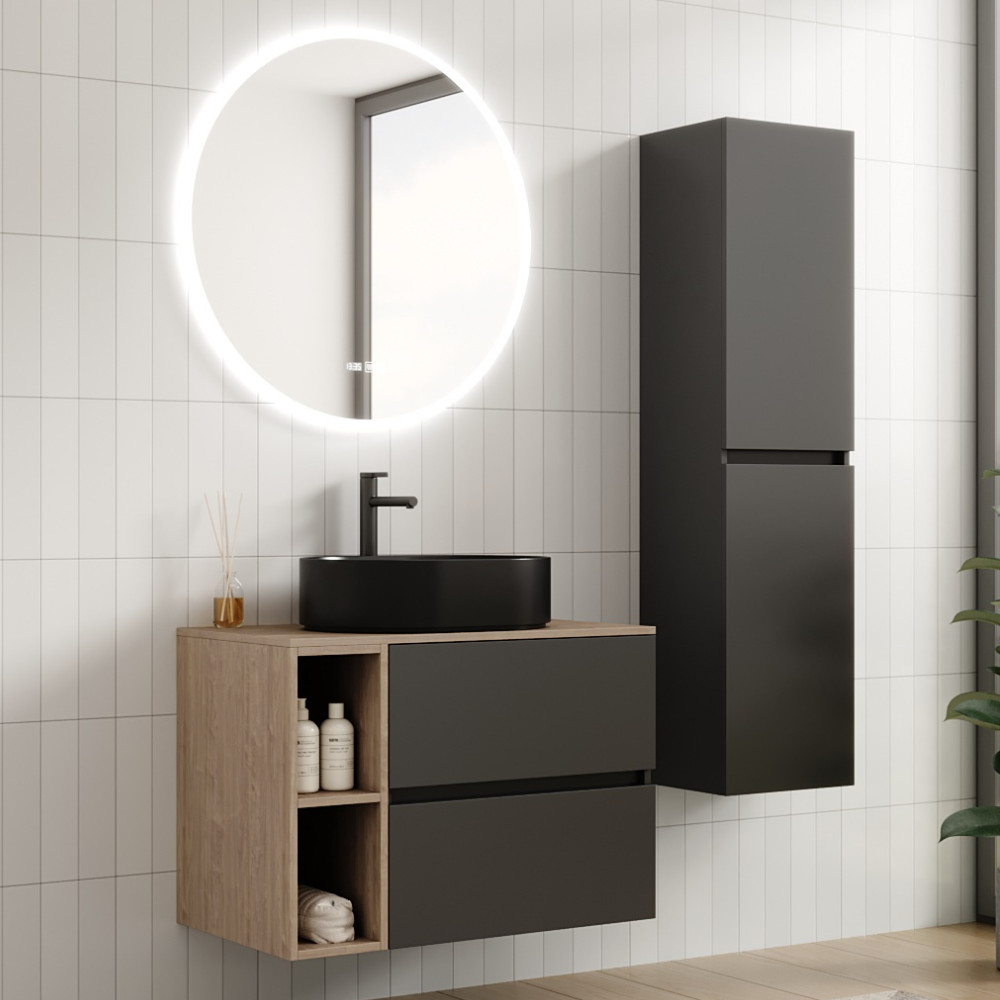 Saját márkás 60 cm széles komplett fürdőszoba bútor fali mosdószekrénnyel antracit színben, tölgyfa színű mosdópulttal és fali okos LED tükörrel, illetve hozzá tartozó 20 cm széles kiegészítő fali modullal.