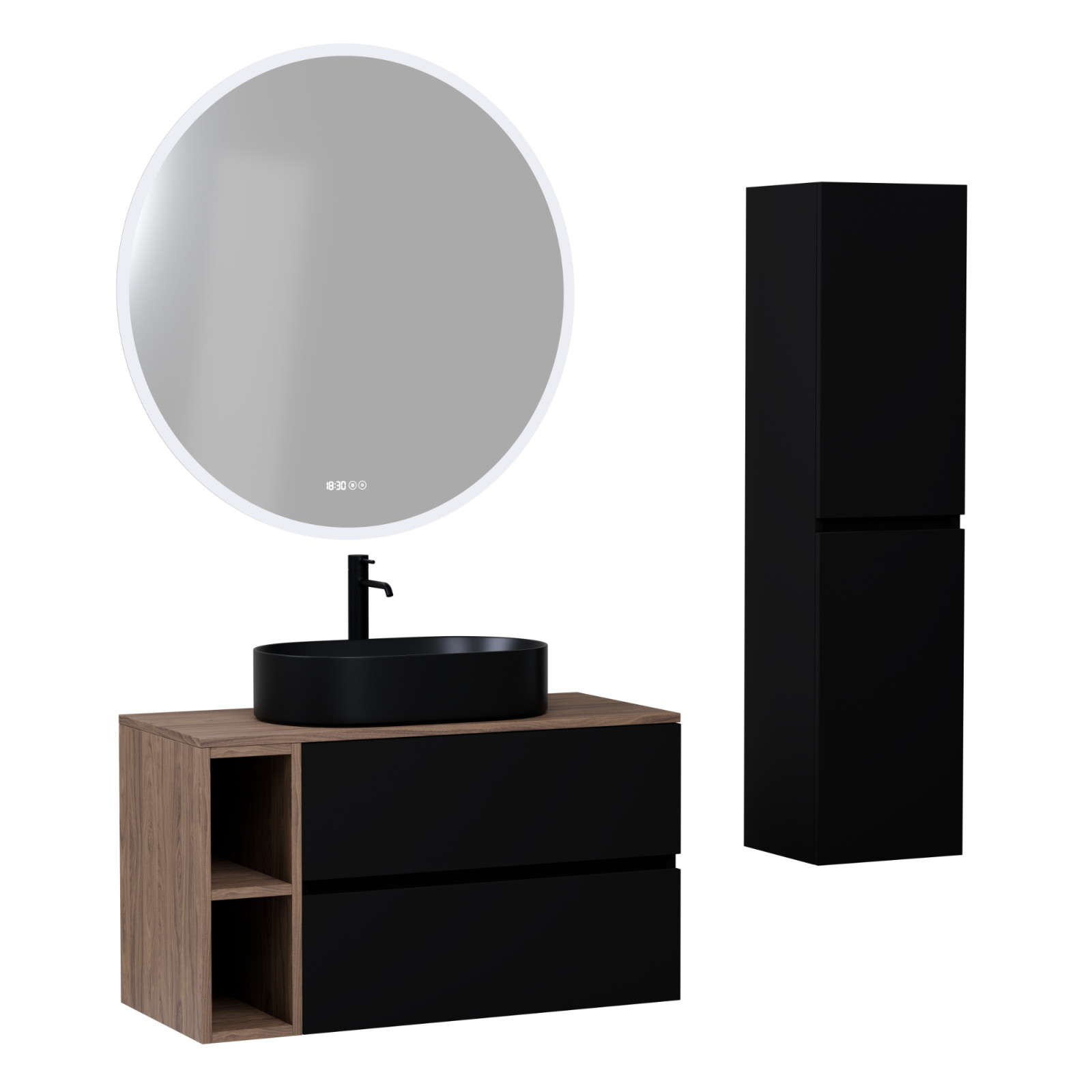 Napjainkban a praktikum mellett a fürdőszoba esztétikus megjelenése is fontos szempont. A függesztett bútorok egyre elterjedtebbé válnak, mivel számos előnnyel rendelkeznek, ide sorolható a modern, könnyed megjelenés és az egyszerű tisztítás . A függesztett fürdőszobai bútorok a klasszikus és modernebb stílusú fürdőszobákban is megállják a helyüket egyaránt. Nagyfokú rugalmasság jellemzi őket, mivel szinte bárhol elhelyezhetők a fürdőszobán belül. További előnyük, hogy soft close (csillapítós) zsanérral felszereltek, így becsukáskor az ajtó vagy fiók finoman záródik be, csökkentve a terhelést és növelve az élettartamot . A szekrény fehér és matt fekete mosdóval, illetve mosdópulttal is szabadon kombinálható ízlés szerint. A teljesség érdekében a mosdószekrényekhez illő LED okostükröt és magasszekrényt is választhatunk, hogy a fürdőszobában lévő bútorok egy szemet gyönyörködtető egységet alkossanak.