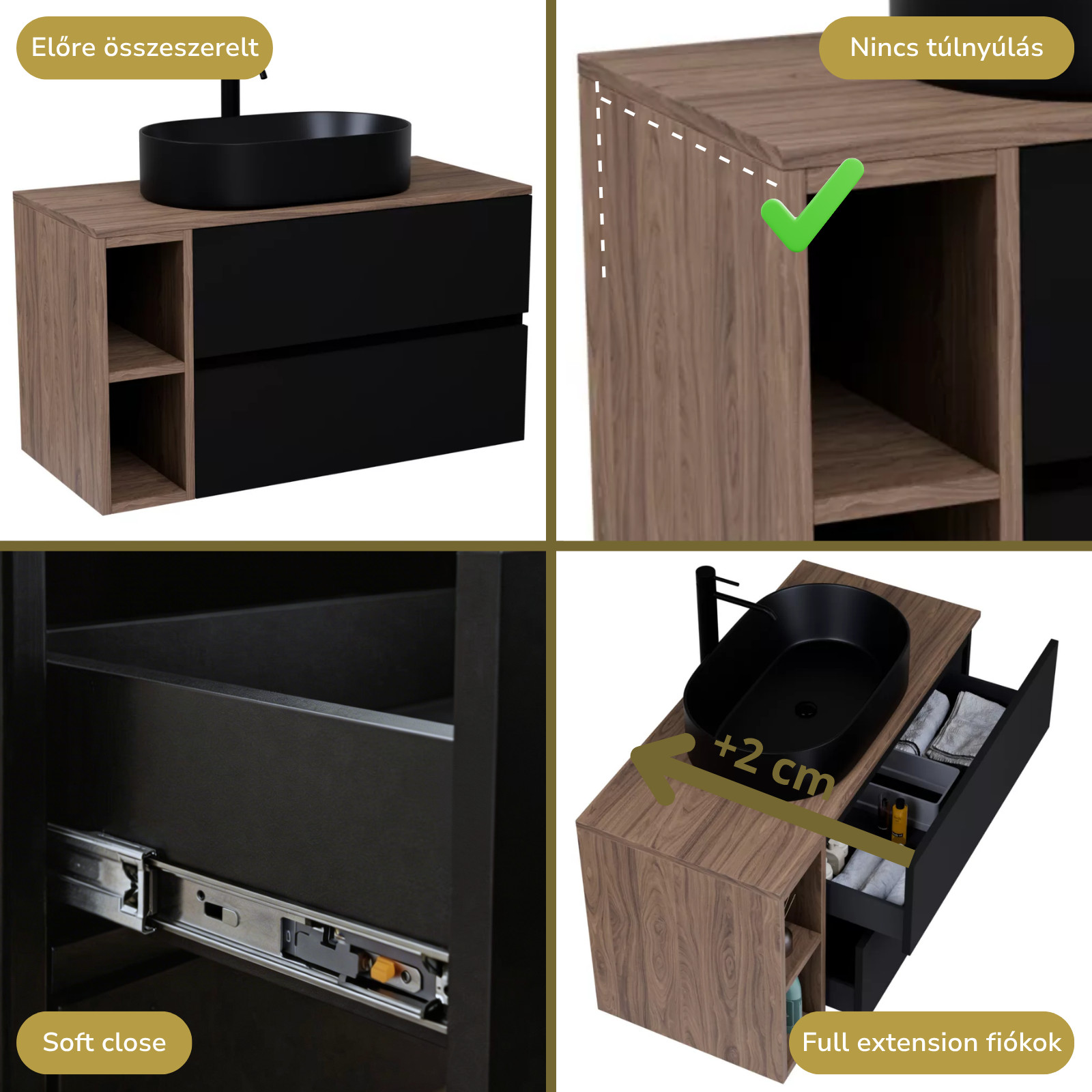 fekete mosdószekrény, teljes kihúzhatóságú fiókokkal