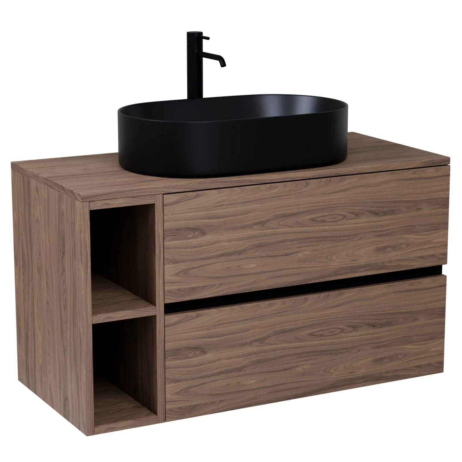 fekete mosdószekrény, teljes kihúzhatóságú fiókokkal