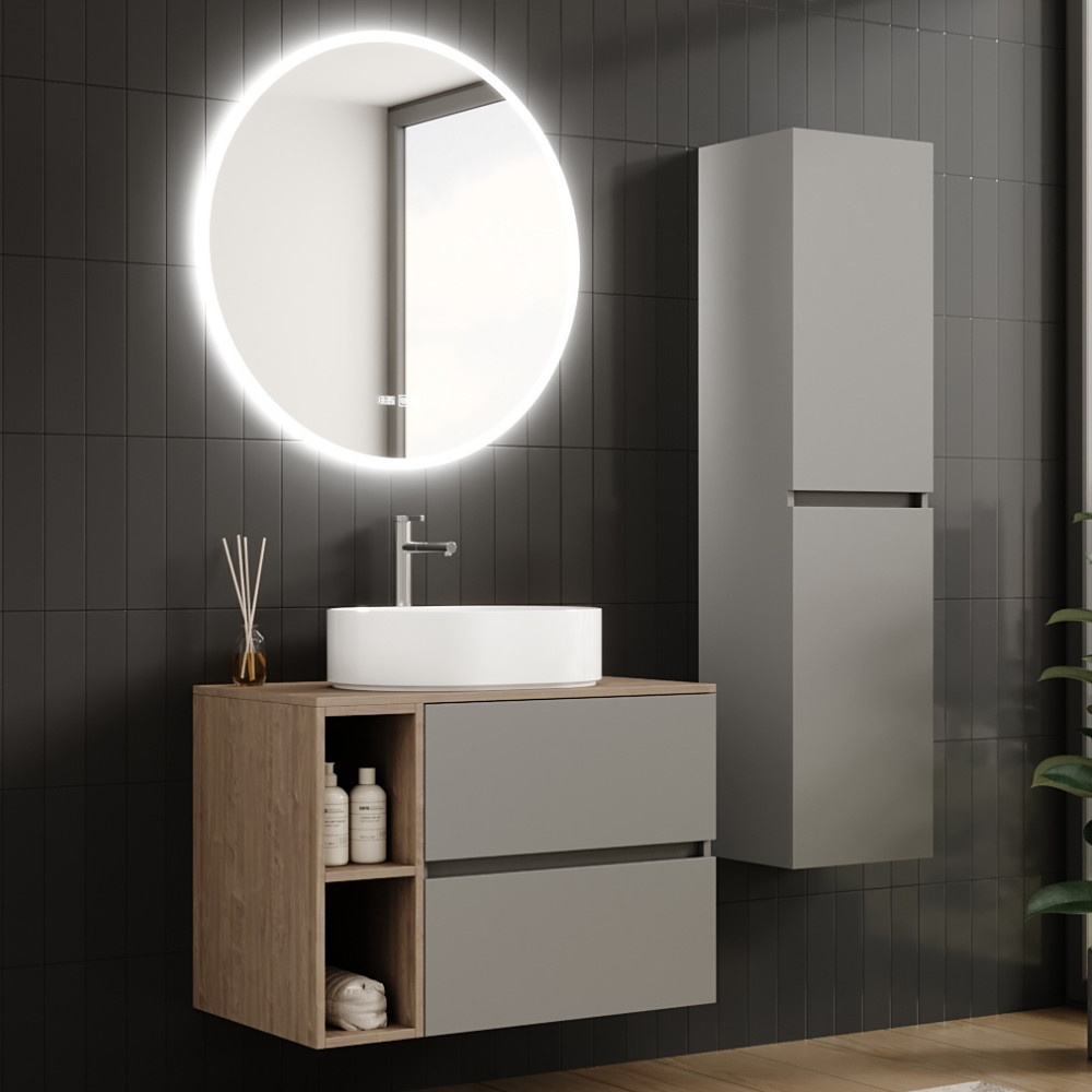 HD Zyra+ Fume Grey 80/100 fali mosdószekrény tölgyfa színű mosdópulttal és kiegészítő tölgyfa színű fali modullal