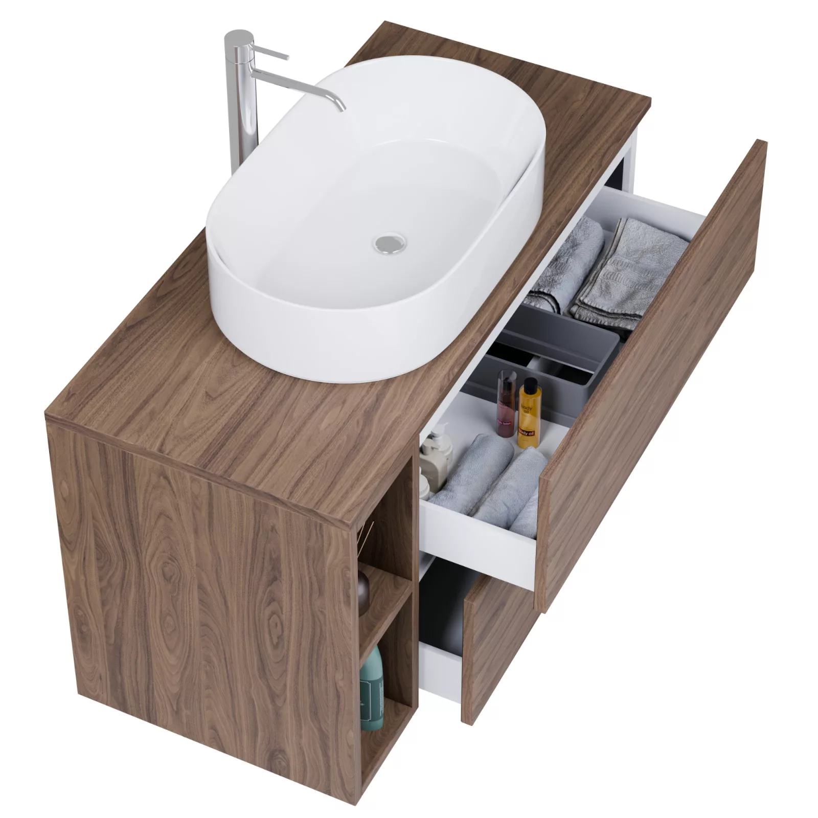 A teljes kihúzású fiók kiemelkedik praktikumával, maximális helykihasználásával és kifinomult működésével a bútorok terén. Kényelmes hozzáférést biztosít a teljes fióktérhez, miközben sima és stabil mozgást garantál. Tartós kialakítása és megbízható szerkezete hosszú távon is zavartalan használatot biztosít.