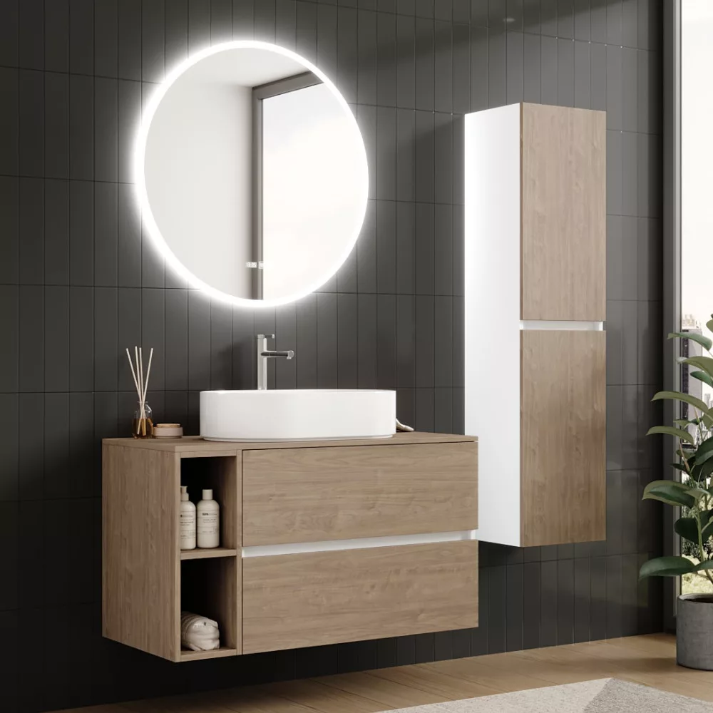 Saját márkás 80 cm széles komplett fürdőszoba bútor fali mosdószekrénnyel fehér színben, tölgyfa színű fiók fronttal, mosdópulttal és fali okos LED tükörrel, illetve hozzá tartozó 20 cm széles kiegészítő fali modullal.