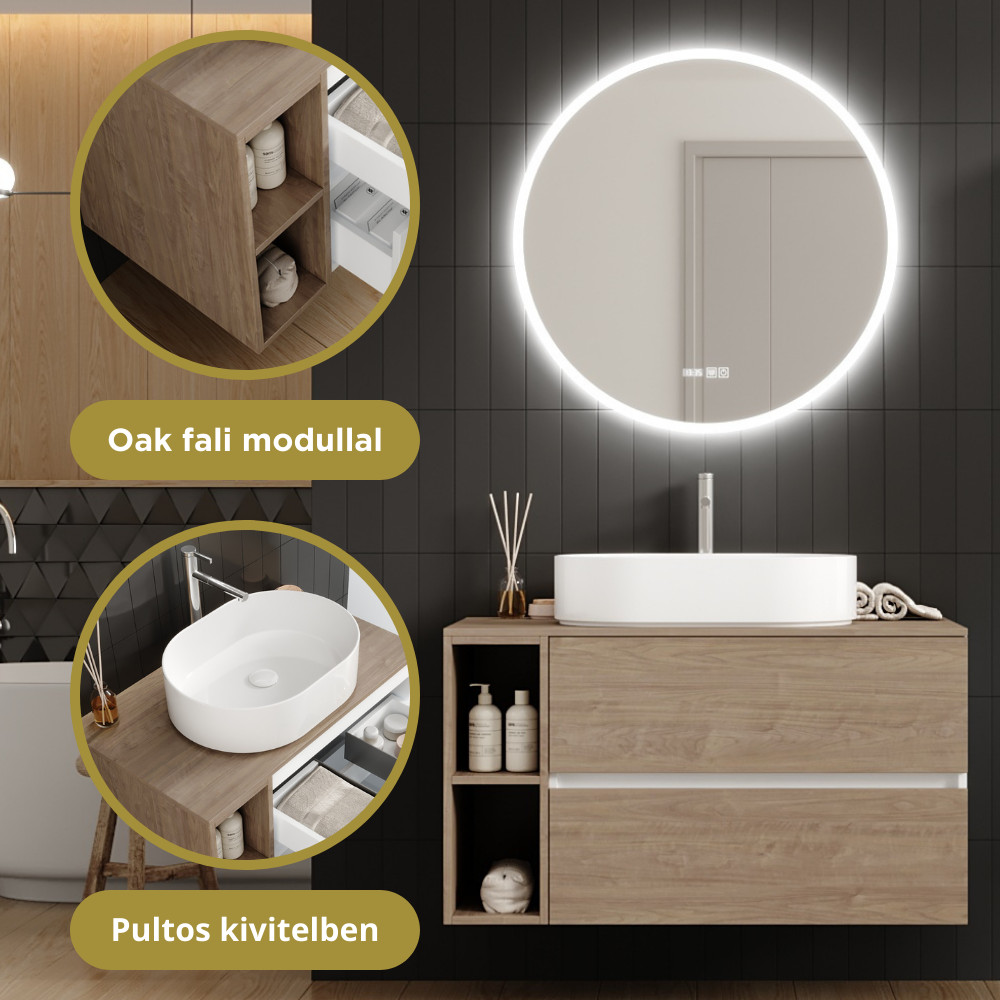 Bútor állapota: Összeszerelt Szett tartalma: Mosdószekrény mosdópulttal (A mosdókagyló és a csaptelep nem tartozék!), okos tükör, magasszekrény Mosdószekrény méret: 80x55x46 cm Mosdópult méret: 100x46x2 cm Tükör méret: 100x100 cm Magas szekrény méret: 35x140x30 cm Tükör funkciók: Digitális óra és páramentesítés A forrás bemeneti teljesítménye: 36 W Anyag: MDF Felszereltség: Ambient világítás, érintés kapcsoló, digitális óra, páramentesítő fűtés, integrált LED világítás Világítás színhőmérséklete: 3000K - 4500K - 6000K (meleg - melegfehér - hidegfehér) Tükör anyaga: Rézmentes ezüst tükör Szekrény felszereltsége: Fiókos Garancia: 2 év Kivetőpánt: Csillapítós (soft close) Tükör vastagság: 5 mm Az általunk legfontosabbnak vélt tulajdonságok A Zyra szekrénynél: