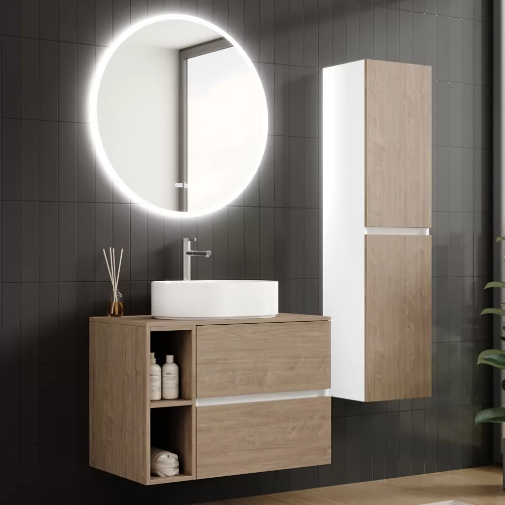 HD Zyra+ Silk Matt White-Oak 80 komplett fürdőszoba bútor fali mosdószekrénnyel, oak mosdópulttal, kiegészítő oak fali modullal és tükörrel