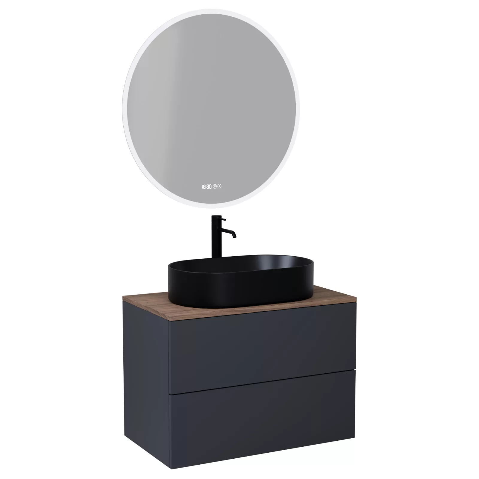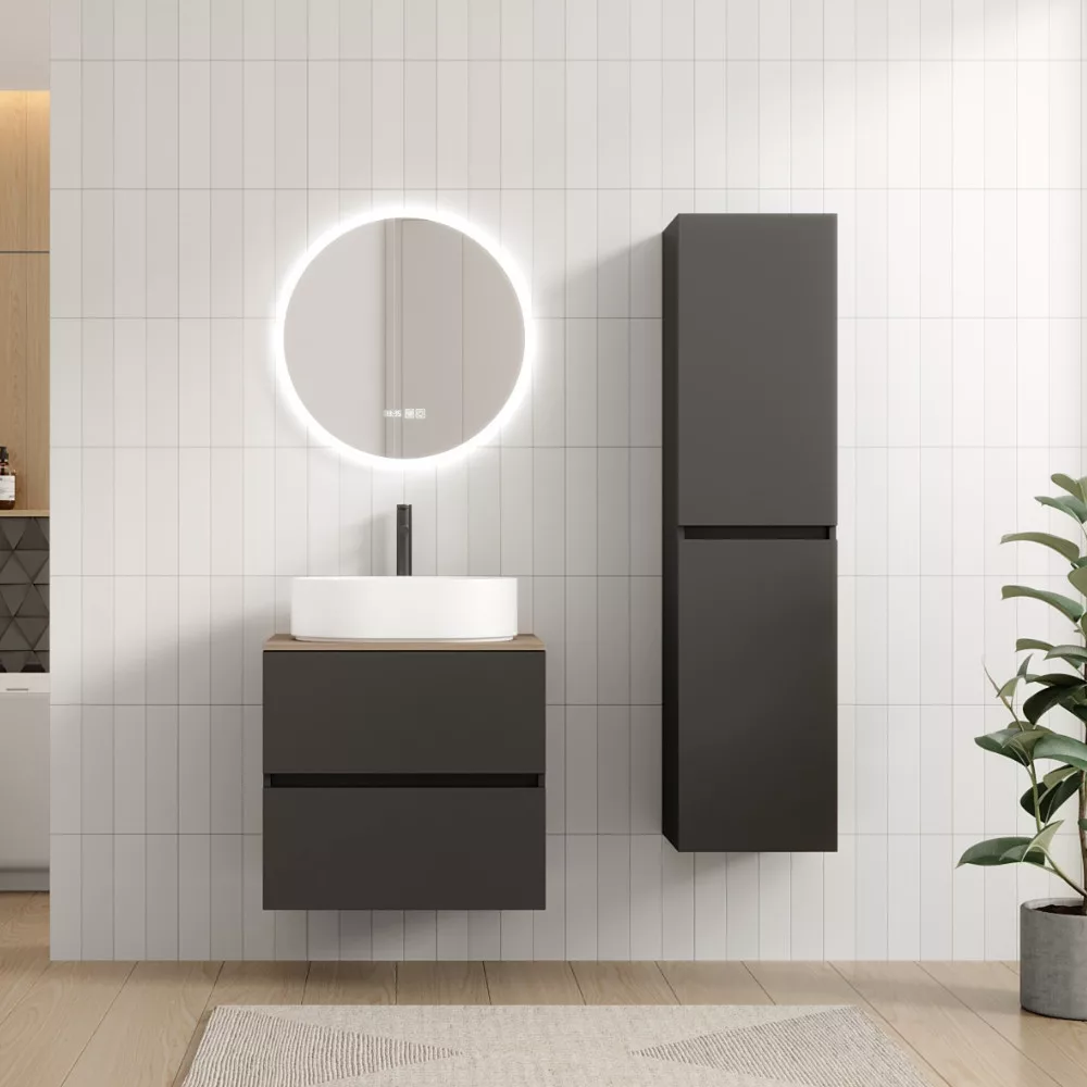Saját márkás 60 cm széles komplett fürdőszoba bútor fali mosdószekrénnyel antracit színben, tölgyfa színű mosdópulttal és fali okos LED tükörrel. A fiókok modern push-to-open mechanizmussal nyílnak, amely mechanikus rugós rendszerrel biztosítja a fogantyú nélküli nyitást.