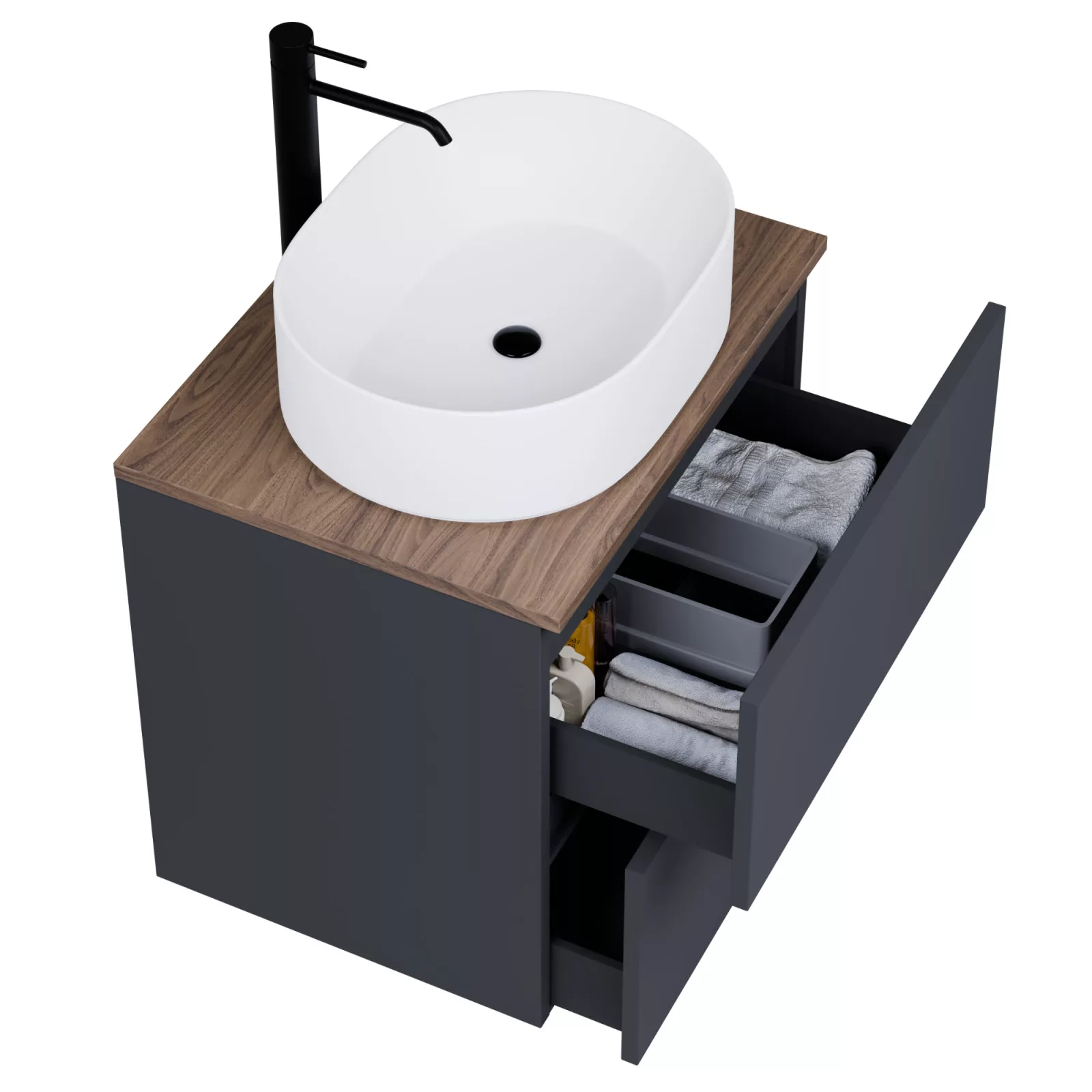 • antracit mosdószekrény, teljes kihúzhatóságú fiókokkal