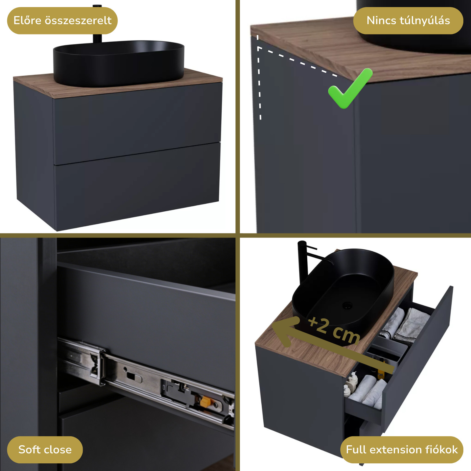 Saját márkás 80 cm széles fali mosdószekrény antracit színben, tölgyfa színű mosdópulttal, rejtett fióksínnel és önbehúzos technológiával ellátott. A fiókok modern push-to-open mechanizmussal nyílnak, amely mechanikus rugós rendszerrel biztosítja a fogantyú nélküli nyitást.