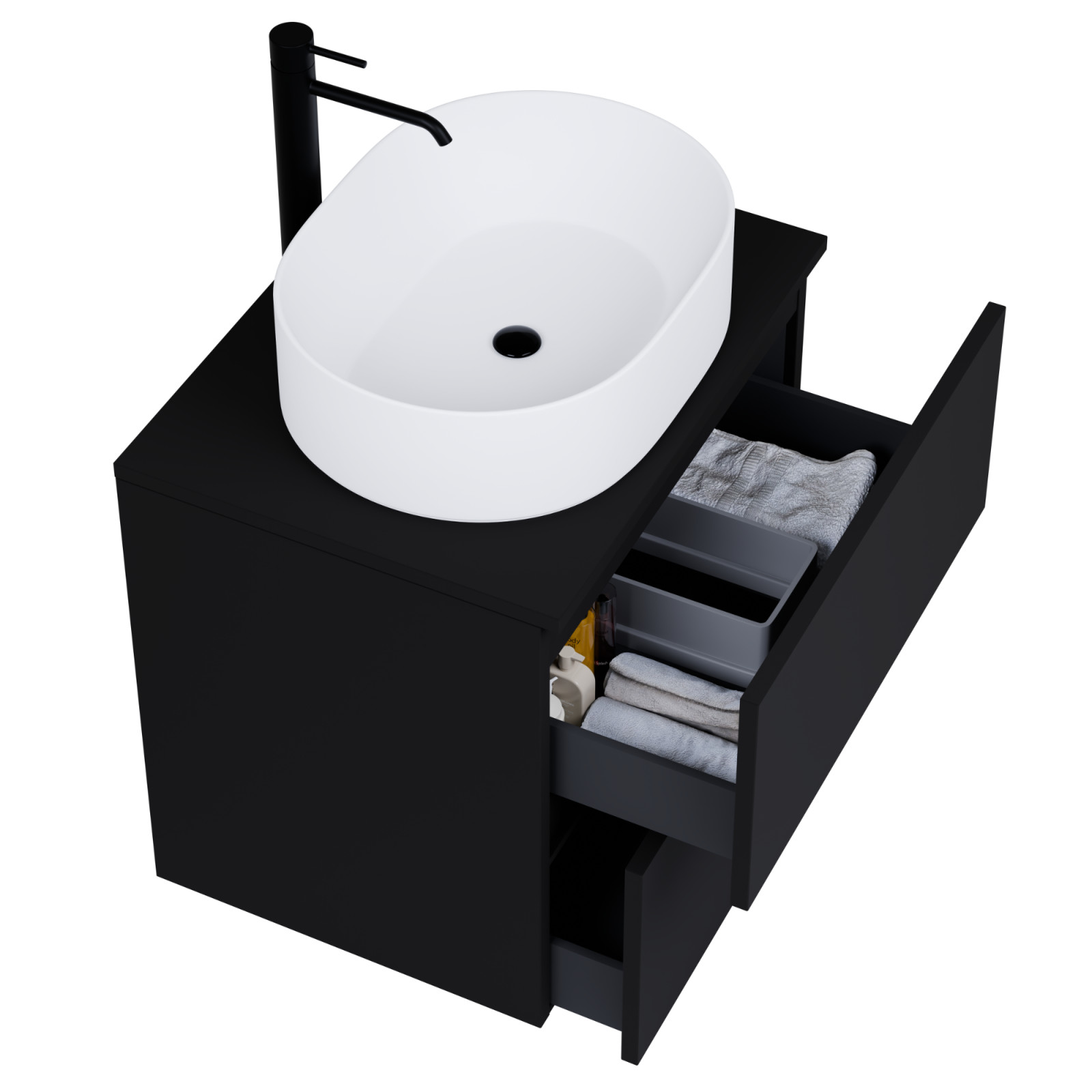 • fekete mosdószekrény, teljes kihúzhatóságú fiókokkal