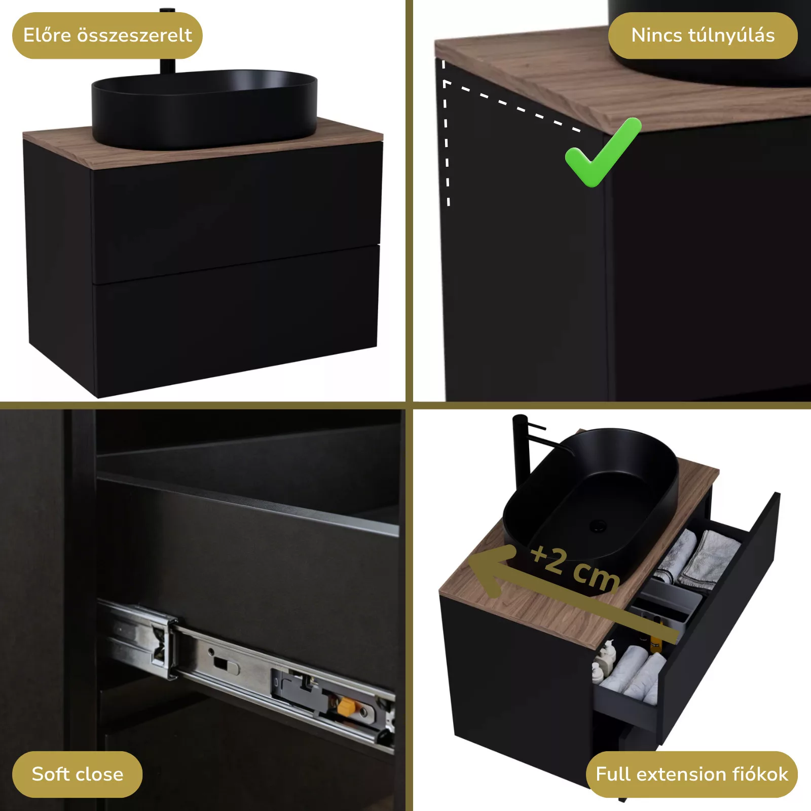 • fekete mosdószekrény, teljes kihúzhatóságú fiókokkal