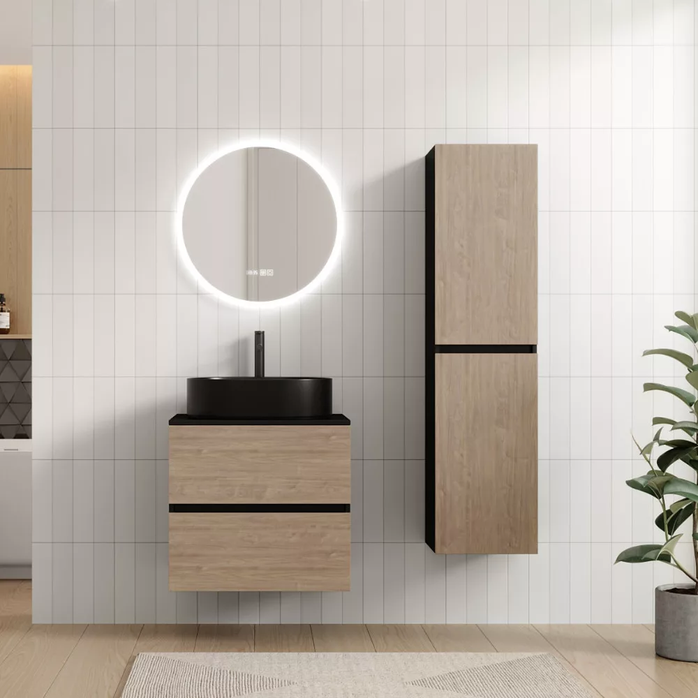 Saját márkás 60 cm széles komplett fürdőszoba bútor fali mosdószekrénnyel fekete színben, tölgyfa színű fiók fronttal, fekete mosdópulttal és fali okos LED tükörrel. A fiókok modern push-to-open mechanizmussal nyílnak, amely mechanikus rugós rendszerrel biztosítja a fogantyú nélküli nyitást.