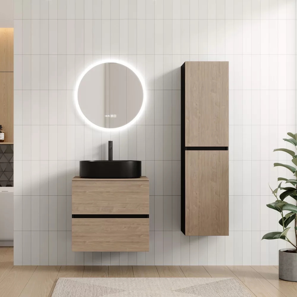 Saját márkás 60 cm széles komplett fürdőszoba bútor fali mosdószekrénnyel fekete színben, tölgyfa színű fiók fronttal, mosdópulttal és fali okos LED tükörrel. A fiókok modern push-to-open mechanizmussal nyílnak, amely mechanikus rugós rendszerrel biztosítja a fogantyú nélküli nyitást.