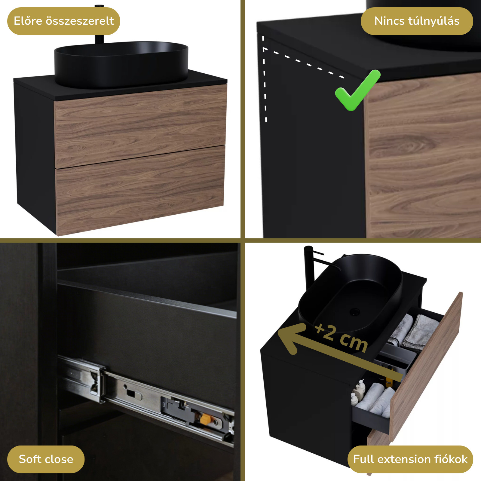 fekete mosdószekrény, teljes kihúzhatóságú fiókokkal