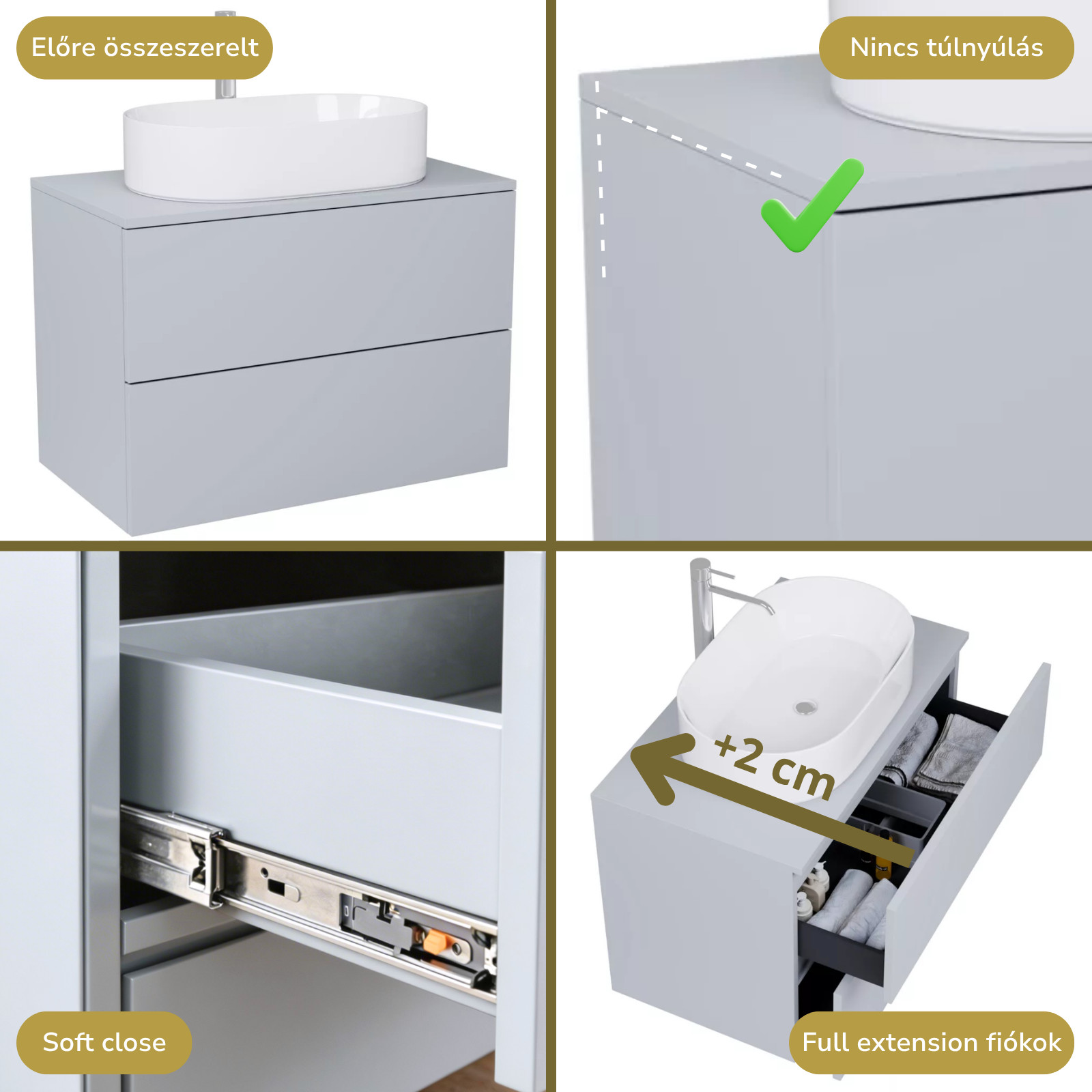 • füst szürke mosdószekrény, teljes kihúzhatóságú fiókokkal