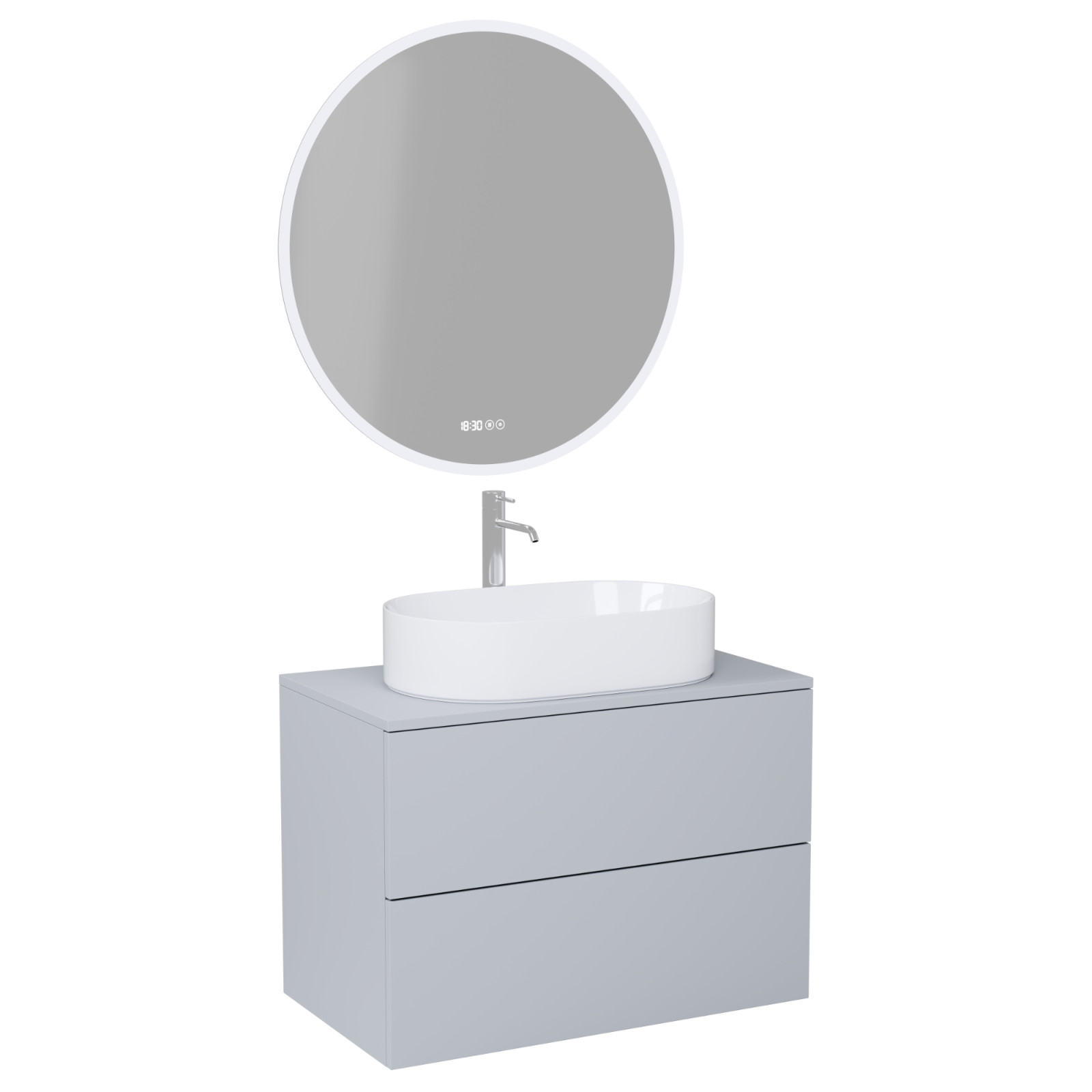 Saját márkás 80 cm széles komplett fürdőszoba bútor fali mosdószekrénnyel füst szürke színben, füst szürke mosdópulttal és fali okos LED tükörrel. A fiókok modern push-to-open mechanizmussal nyílnak, amely mechanikus rugós rendszerrel biztosítja a fogantyú nélküli nyitást.