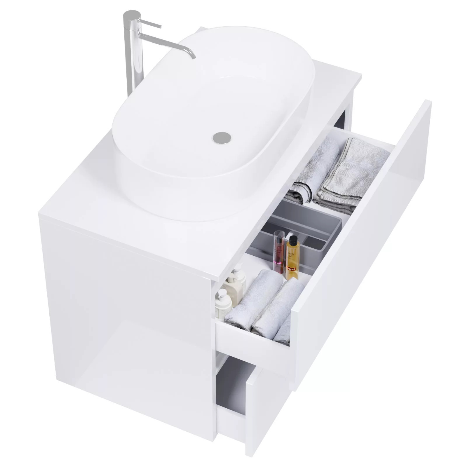 • fényes fehér mosdószekrény, teljes kihúzhatóságú fiókokkal