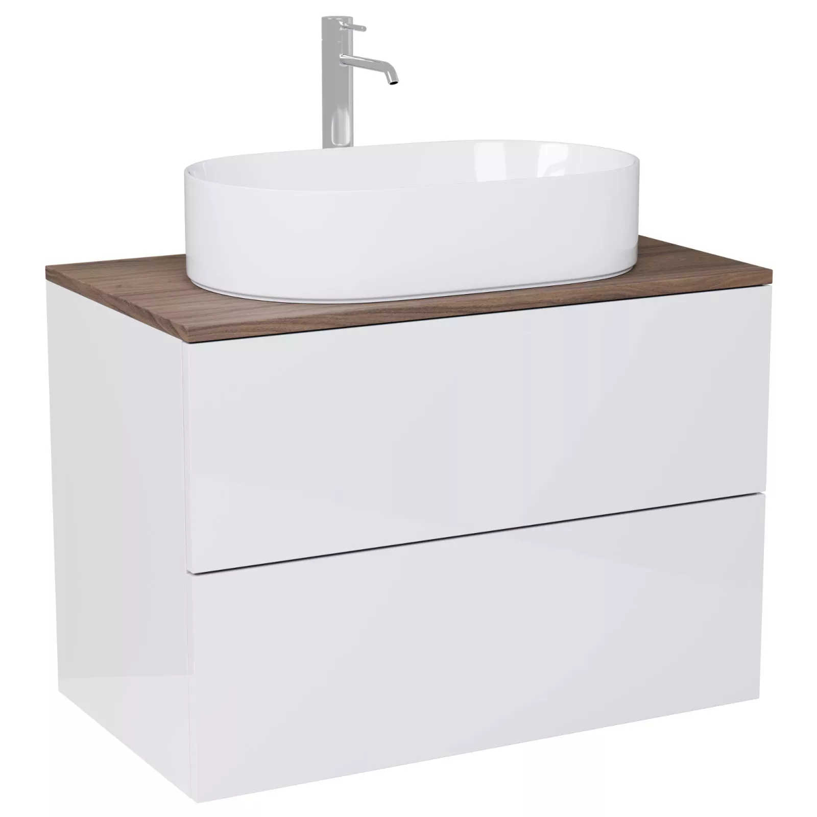 • fényes fehér mosdószekrény, teljes kihúzhatóságú fiókokkal