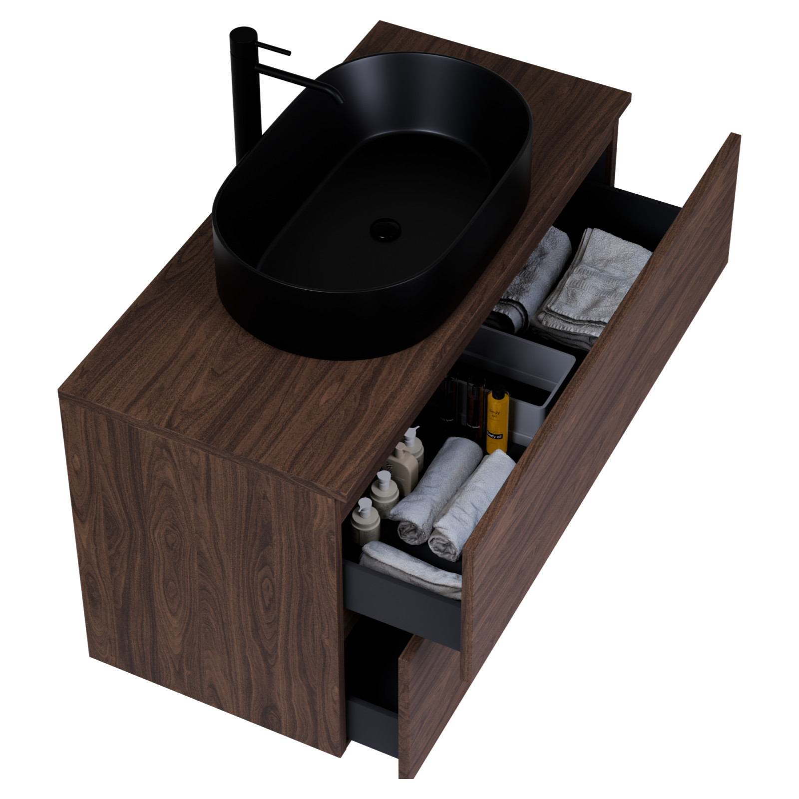 Saját márkás 100 cm széles fali mosdószekrény mogyoró színben, mogyoró színű mosdópulttal, rejtett fióksínnel és önbehúzos technológiával ellátott. A fiókok modern push-to-open mechanizmussal nyílnak, amely mechanikus rugós rendszerrel biztosítja a fogantyú nélküli nyitást.