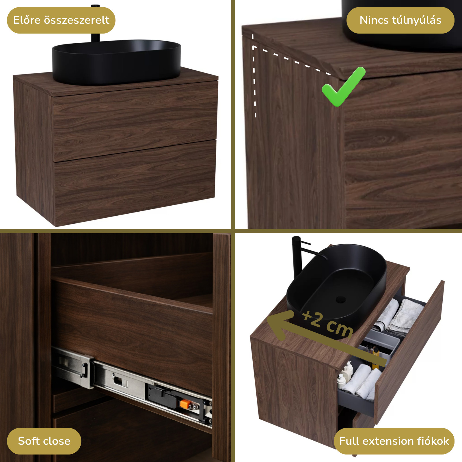 • mogyoró színű mosdószekrény, teljes kihúzhatóságú fiókokkal