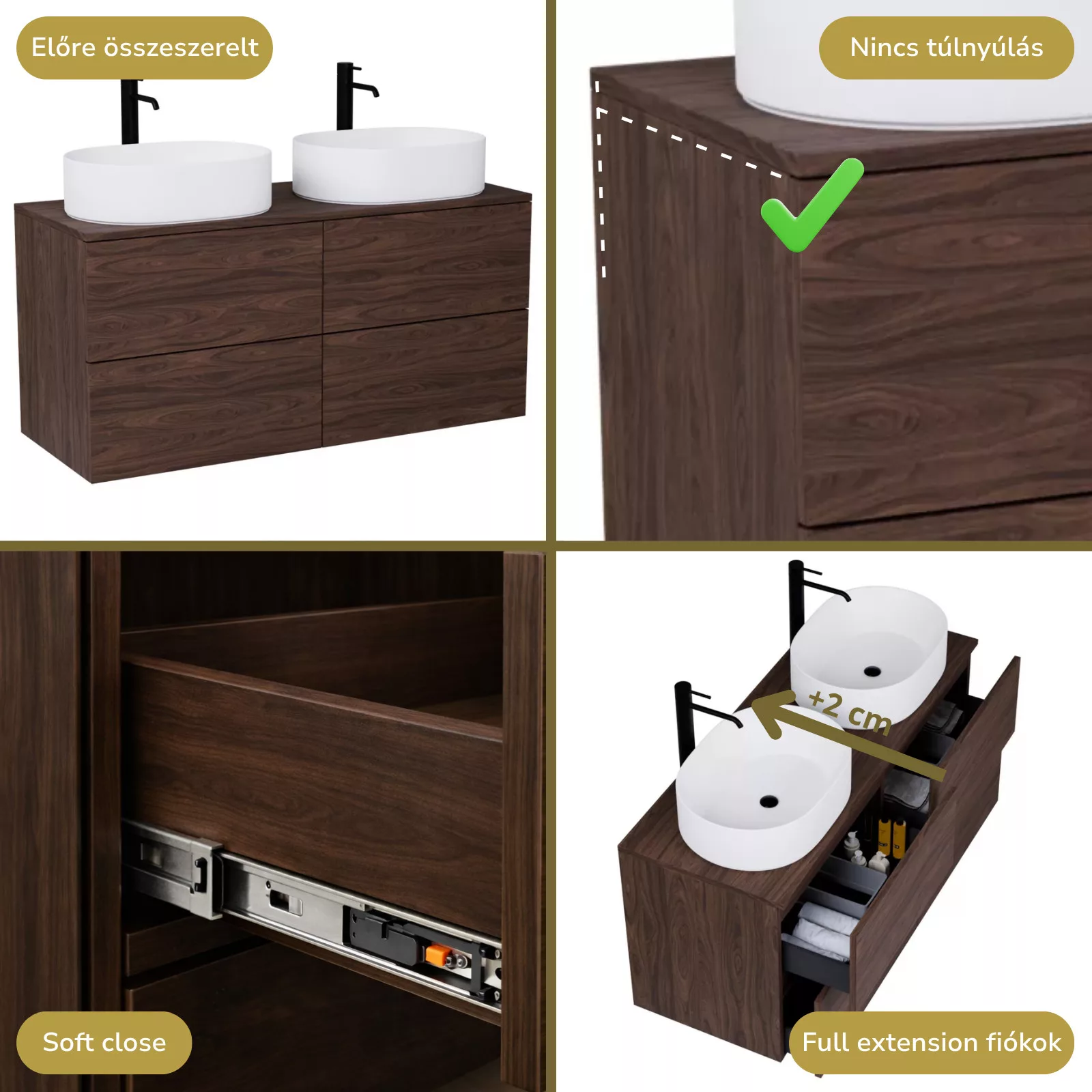 mogyoró színű mosdószekrény, teljes kihúzhatóságú fiókokkal