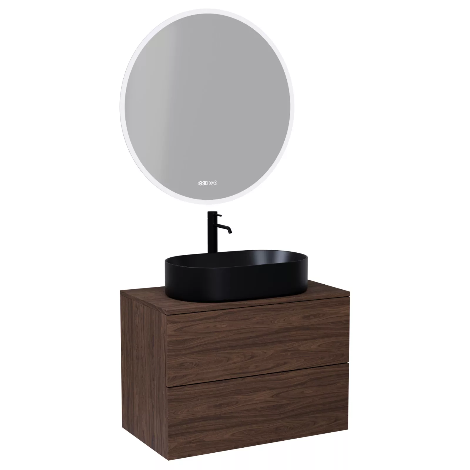 Saját márkás 80 cm széles komplett fürdőszoba bútor fali mosdószekrénnyel mogyoró színben, mogyoró színű mosdópulttal és fali okos LED tükörrel. A fiókok modern push-to-open mechanizmussal nyílnak, amely mechanikus rugós rendszerrel biztosítja a fogantyú nélküli nyitást.