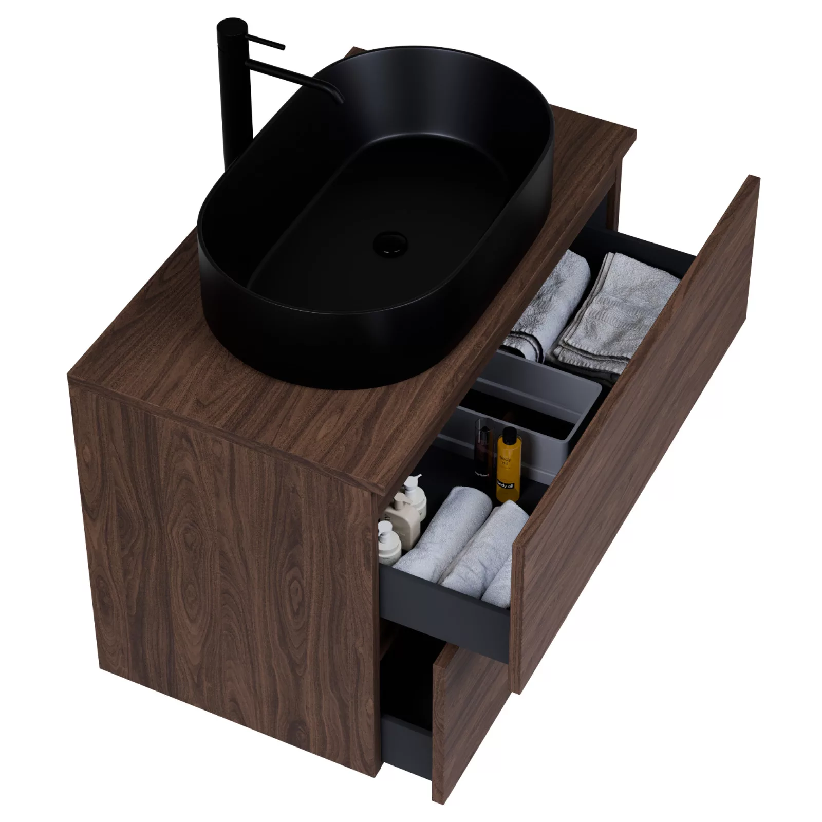 mogyoró színű mosdószekrény, teljes kihúzhatóságú fiókokkal