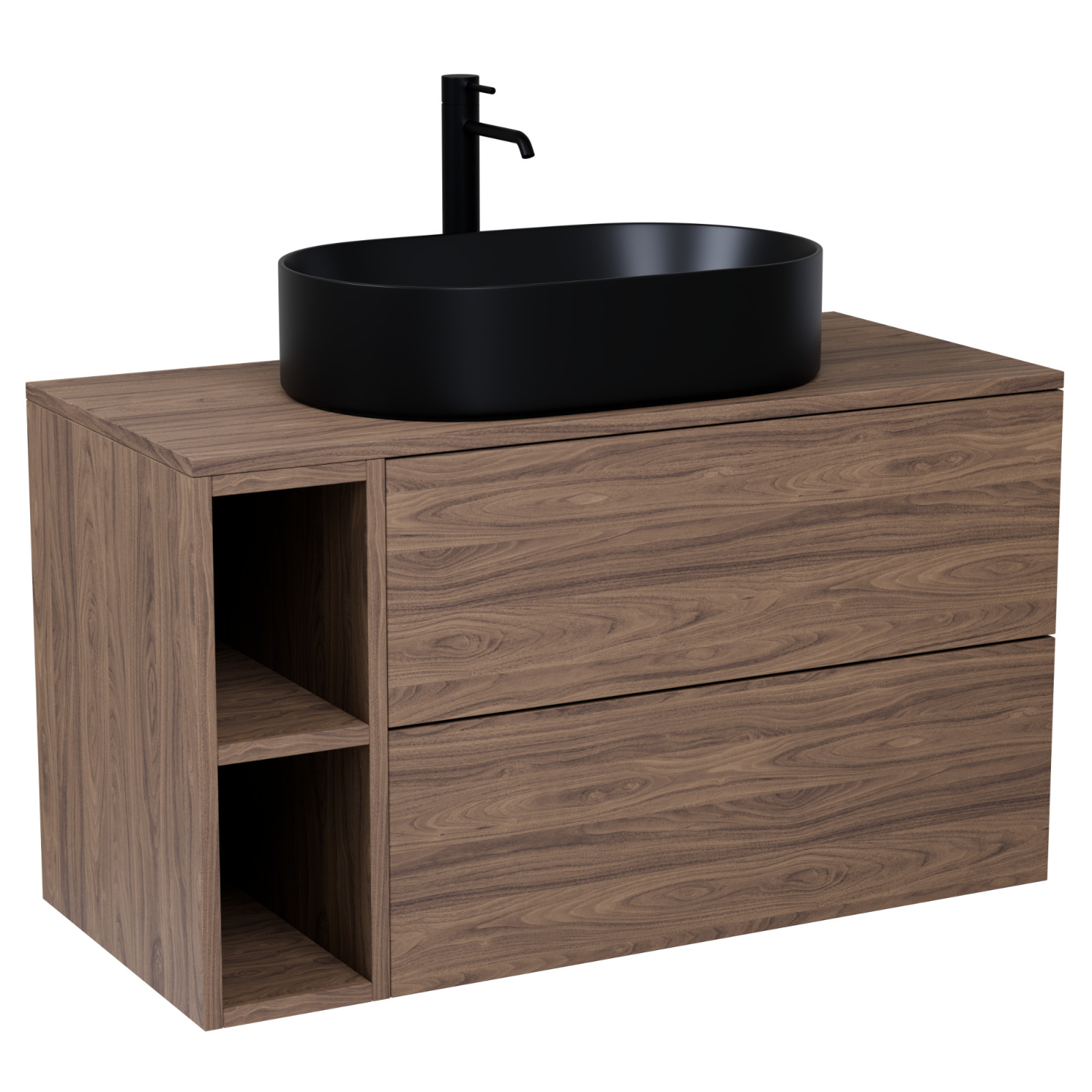 Saját márkás 60 cm széles fali mosdószekrény fekete színben, tölgyfa színű fiók fronttal és mosdópulttal, rejtett fióksínnel és önbehúzos technológiával ellátva, illetve hozzá tartozó 20 cm széles kiegészítő fali modullal. A fiókok modern push-to-open mechanizmussal nyílnak, amely mechanikus rugós rendszerrel biztosítja a fogantyú nélküli nyitást.