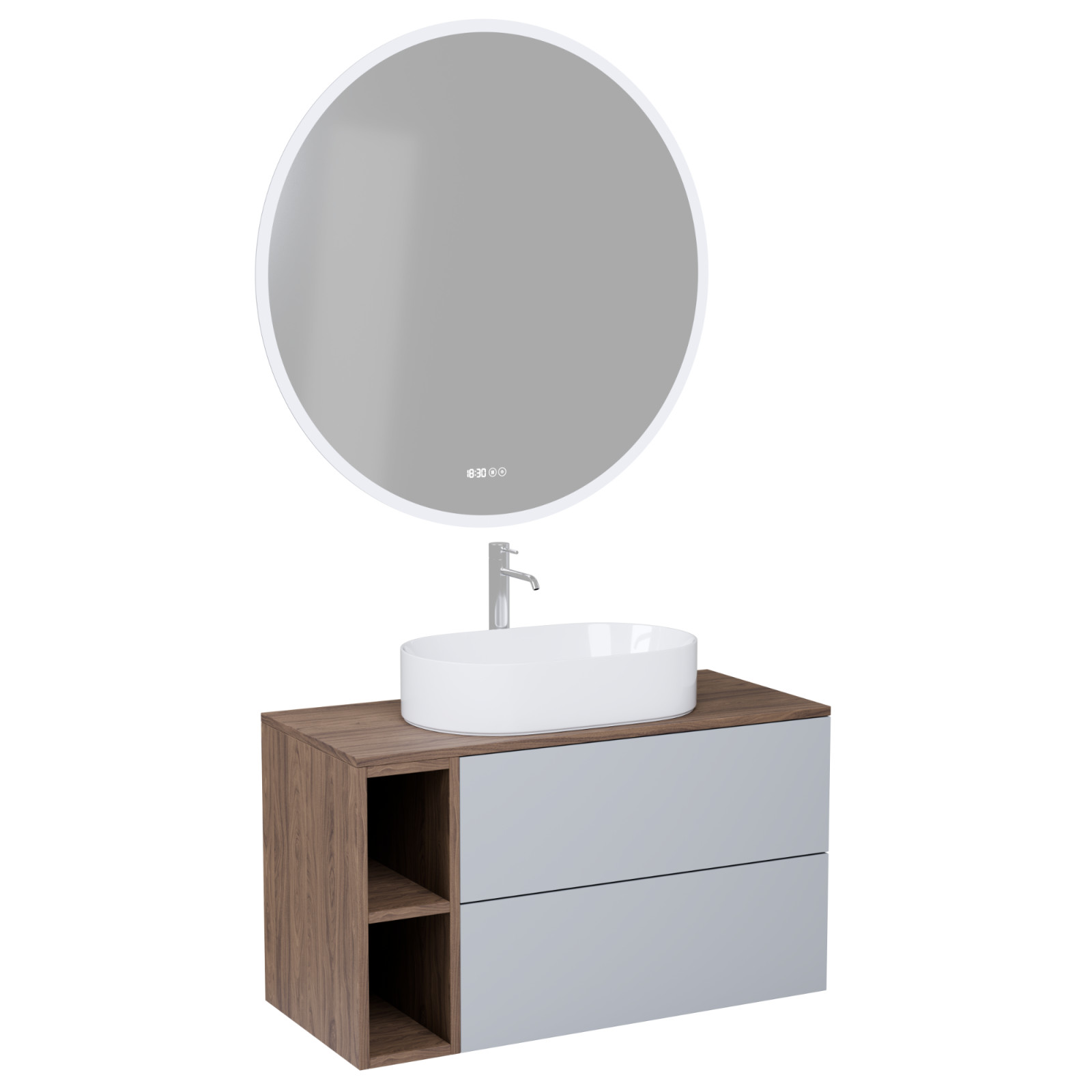 Saját márkás 80 cm széles komplett fürdőszoba bútor fali mosdószekrénnyel füst szürke színben, tölgyfa színű mosdópulttal és fali okos LED tükörrel, illetve hozzá tartozó 20 cm széles kiegészítő fali modullal. A fiókok modern push-to-open mechanizmussal nyílnak, amely mechanikus rugós rendszerrel biztosítja a fogantyú nélküli nyitást.