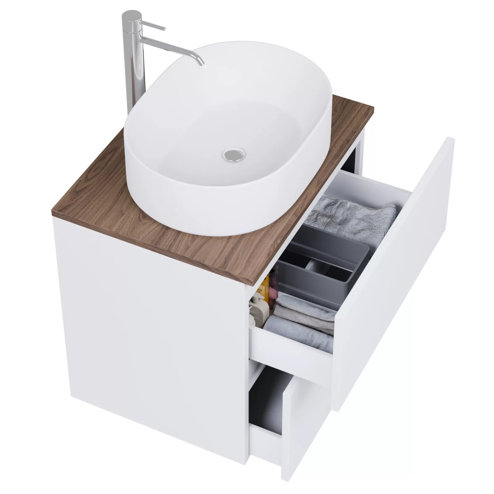 • selymes matt fehér mosdószekrény, teljes kihúzhatóságú fiókokkal