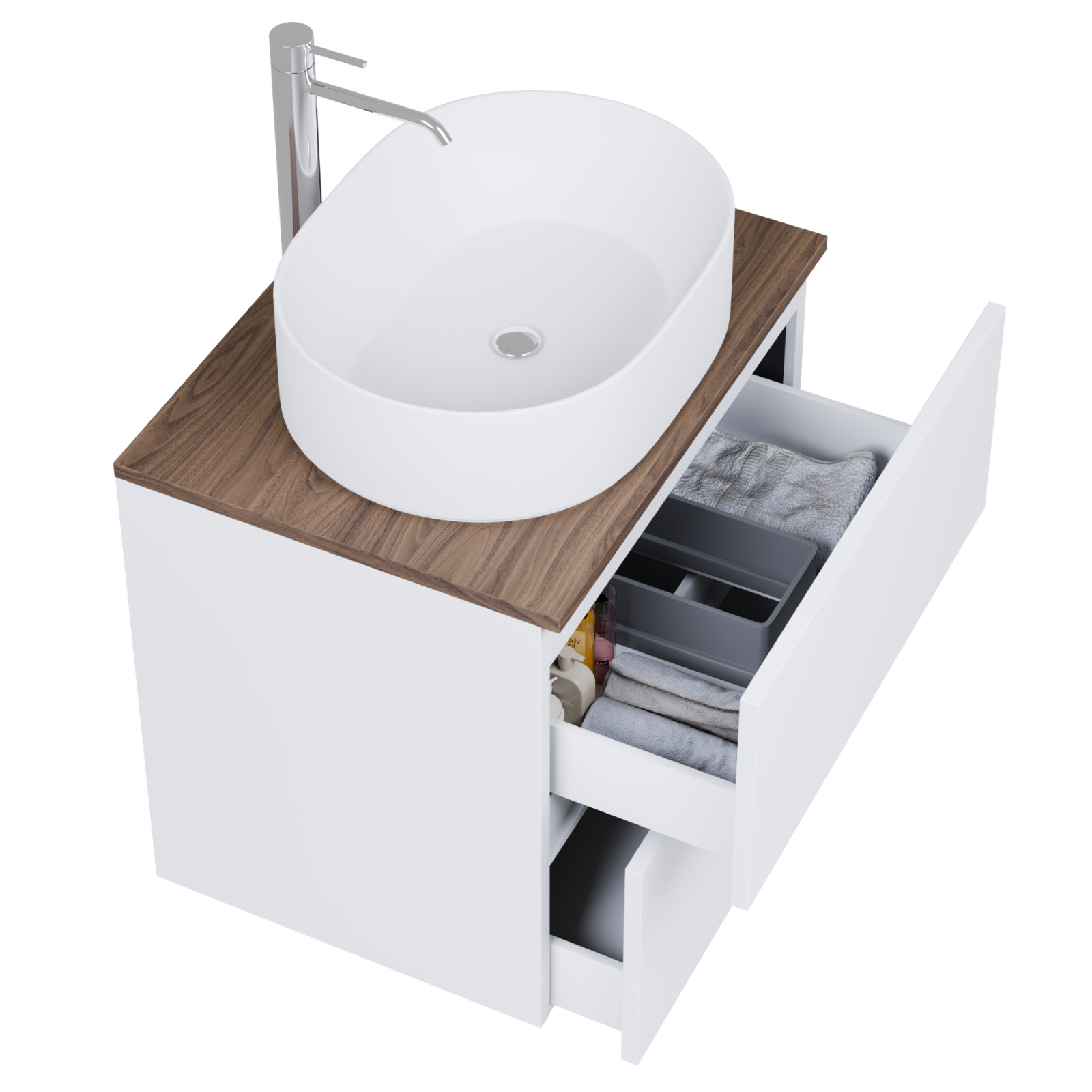 selymes matt fehér mosdószekrény, teljes kihúzhatóságú fiókokkal
