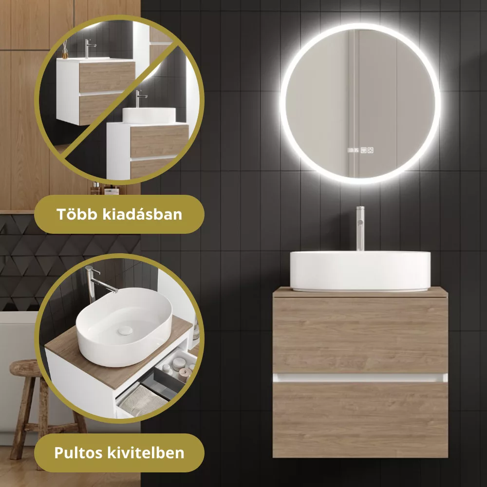 Saját márkás 60 cm széles komplett fürdőszoba bútor fali mosdószekrénnyel fehér színben, tölgyfa színű fiók fronttal, mosdópulttal és fali okos LED tükörrel. A fiókok modern push-to-open mechanizmussal nyílnak, amely mechanikus rugós rendszerrel biztosítja a fogantyú nélküli nyitást.