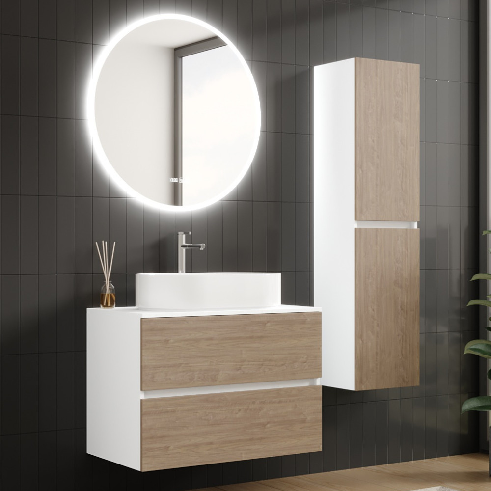 Saját márkás 80 cm széles komplett fürdőszoba bútor fali mosdószekrénnyel fehér színben, tölgyfa színű fiók fronttal, fehér mosdópulttal és fali okos LED tükörrel.
