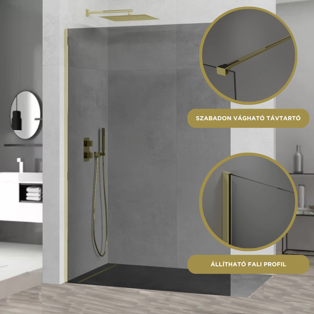 A mai modern stílusnak megfelelően alkottuk meg a visszafogott, mégis szemet gyönyörködtető Walk-In zuhanyfalunkat. Helyet kaphat bármilyen stílusú fürdőszobában, képes a belső összképhez hozzájárulni. Az arany színű profilok és távtartó remek színárnyalatban készülnek el, ami a különböző megvilágítások alatt is kellemes érzetet keltenek.