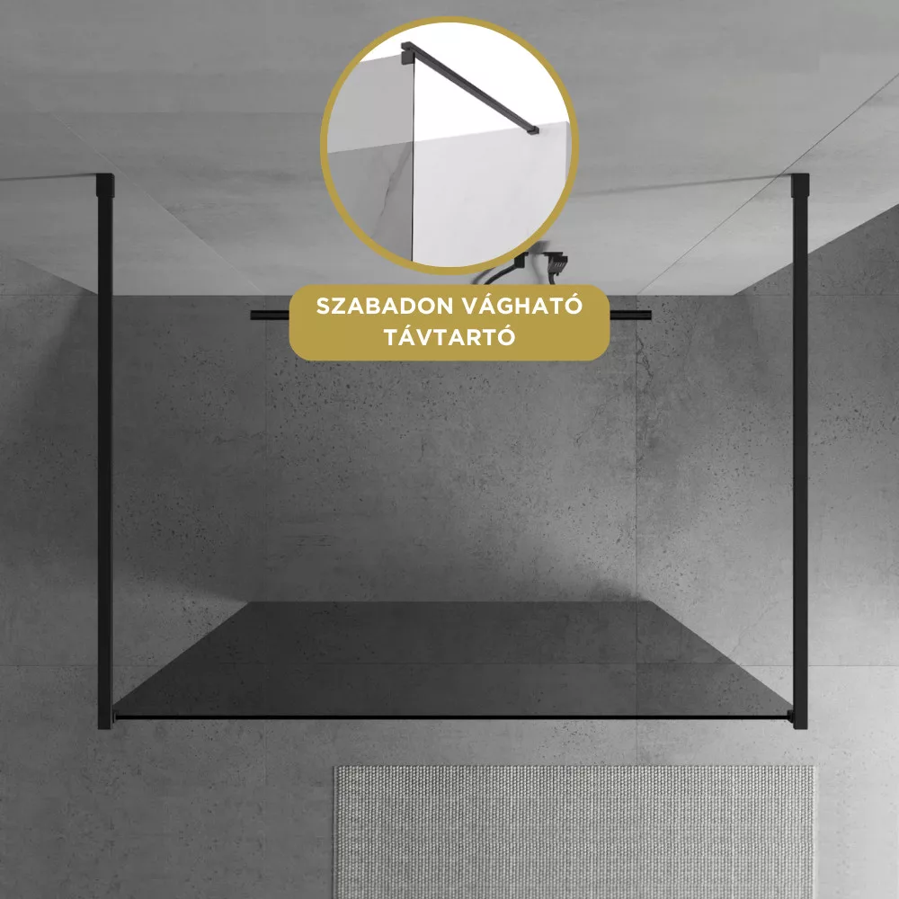 A távtartó 50 és 150 cm között szabadon vágható, így az igényeknek megfelelően lehet beállítani a zuhanyfal távolságát a faltól.