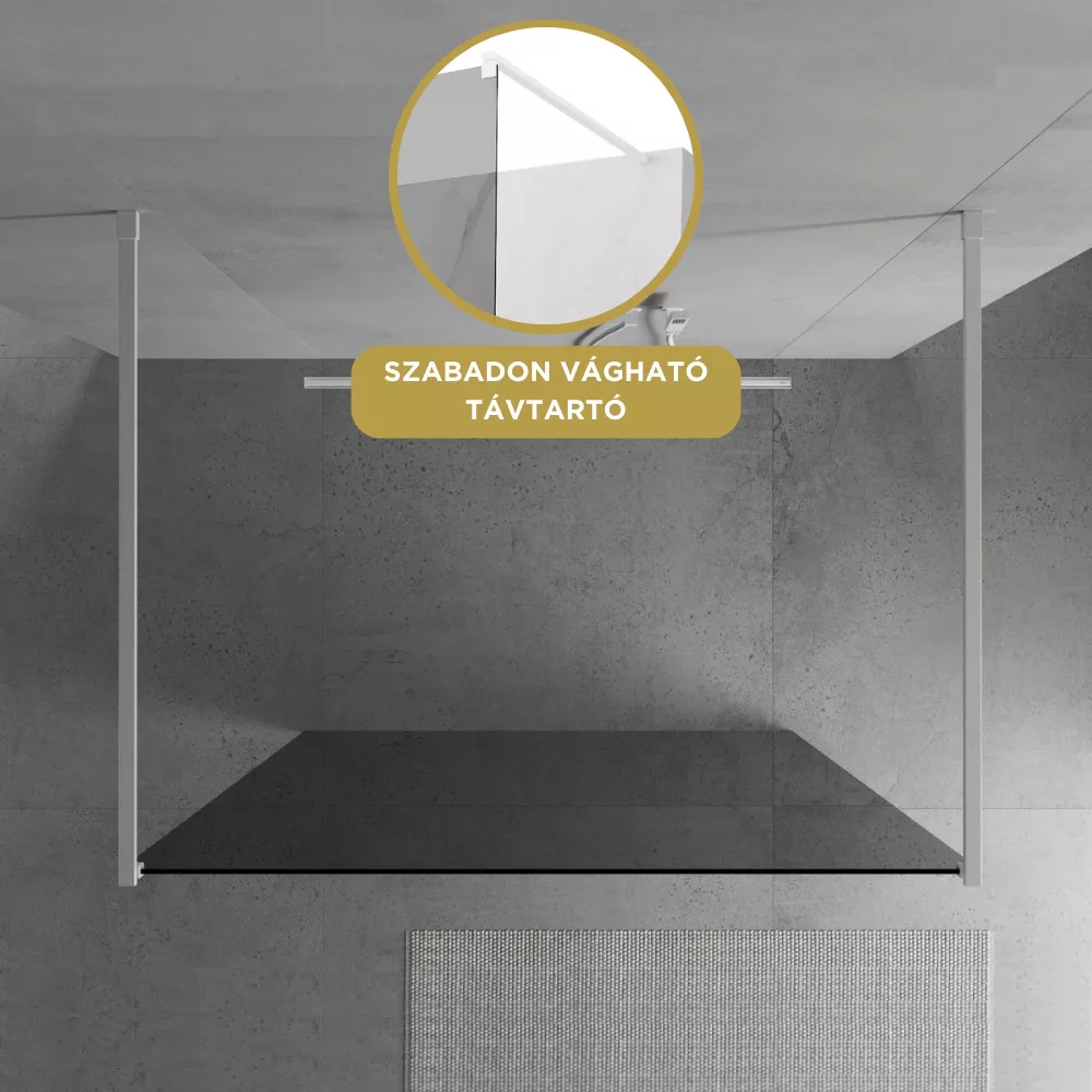 A távtartó 50 és 150 cm között szabadon vágható, így az igényeknek megfelelően lehet beállítani a zuhanyfal távolságát a faltól.