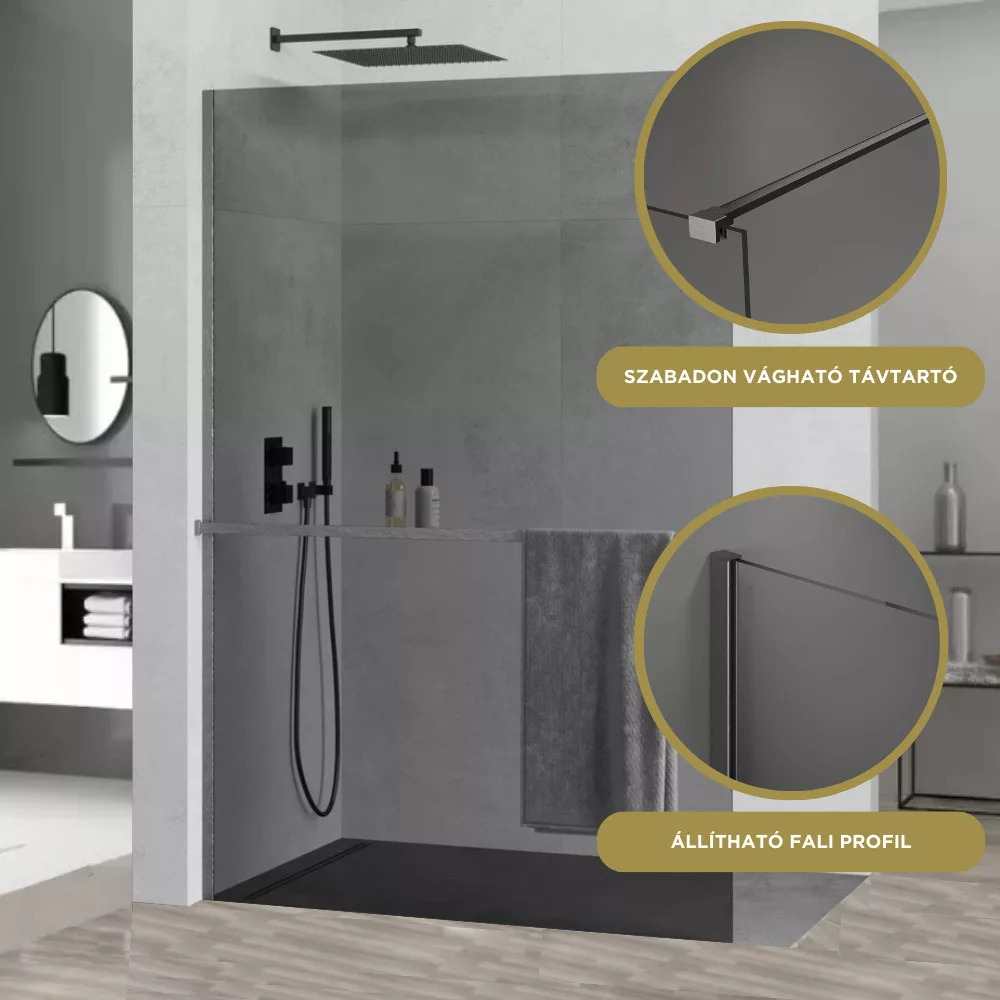 A mai modern stílusnak megfelelően alkottuk meg a visszafogott, mégis szemet gyönyörködtető Walk-In zuhanyfalunkat. Helyet kaphat bármilyen stílusú fürdőszobában, képes a belső összképhez hozzájárulni. A szürke színű profilok, a távtartó és a tusfürdő tartó polc remek színárnyalatban készülnek el, ami a különböző megvilágítások alatt is kellemes érzetet keltenek. A polc egyaránt alkalmas a tusfürdő tárolására és a törölköző tárolására, így biztosítva még nagyobb kényelmet a használat során!