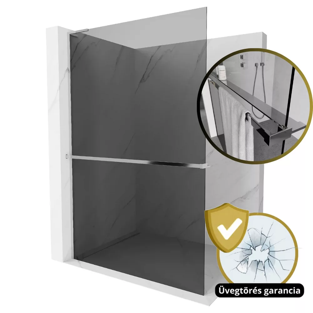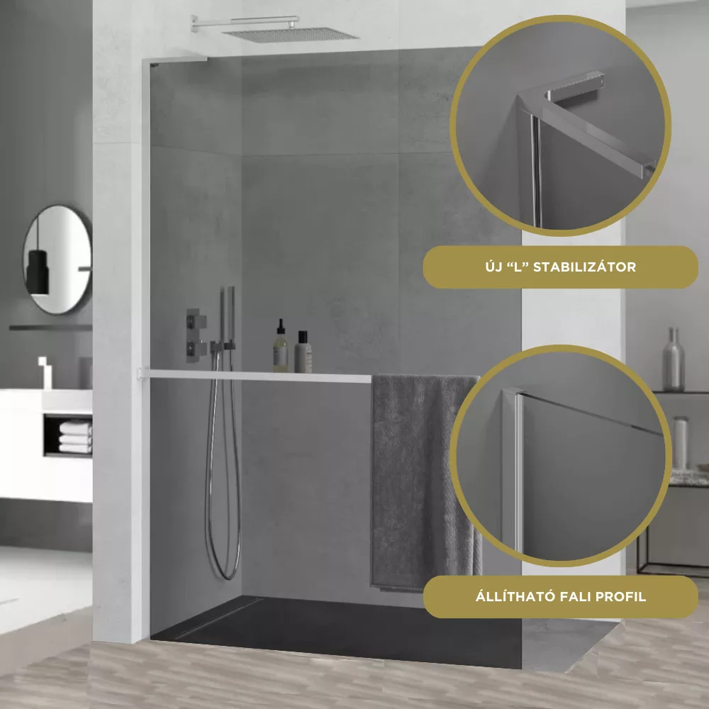 A mai modern stílusnak megfelelően alkottuk meg a visszafogott, mégis szemet gyönyörködtető Walk-In zuhanyfalunkat. Helyet kaphat bármilyen stílusú fürdőszobában, képes a belső összképhez hozzájárulni. A króm színű profilok, a "L" stabilizátor és a tusfürdő tartó polc remek színárnyalatban készülnek el, ami a különböző megvilágítások alatt is kellemes érzetet keltenek. A polc egyaránt alkalmas a tusfürdő tárolására és a törölköző tárolására, így biztosítva még nagyobb kényelmet a használat során!