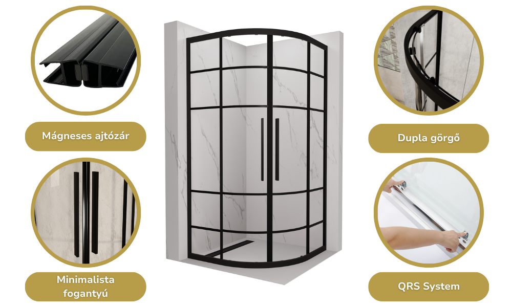 Az általunk legfontosabbnak vélt tulajdonságok íves zuhanykabinunknál:
