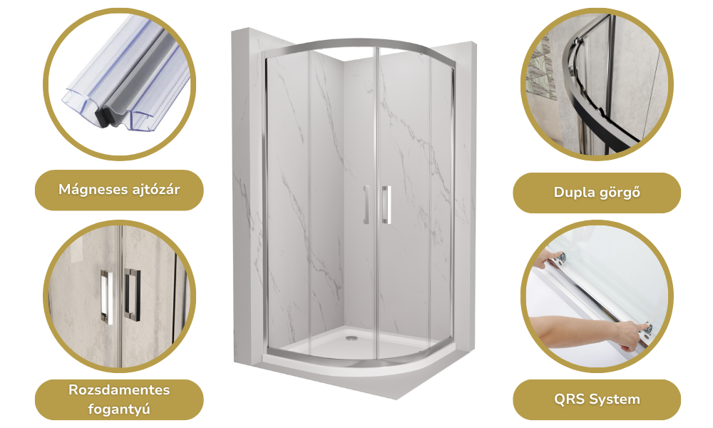 Az általunk legfontosabbnak vélt tulajdonságok íves zuhanykabinunknál: