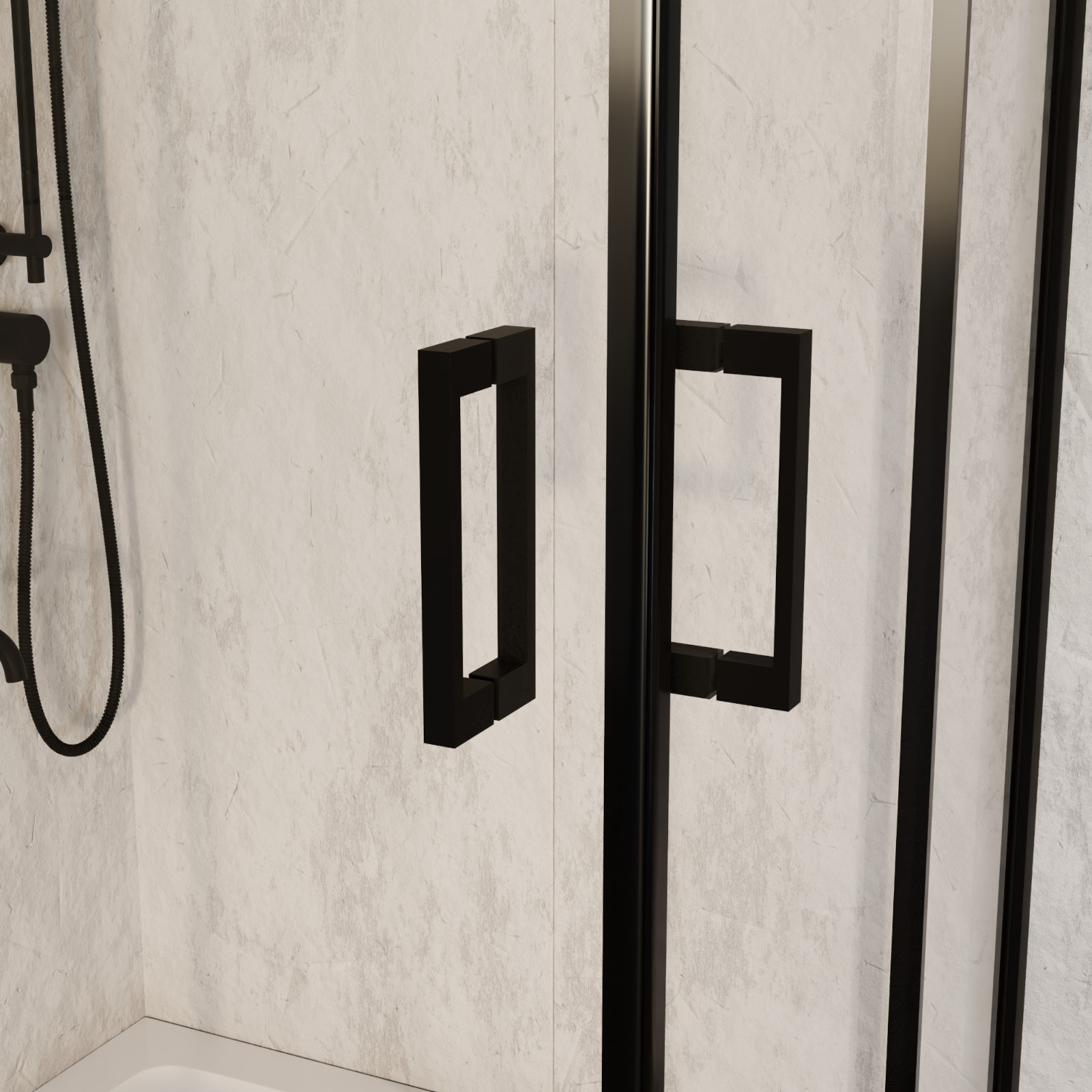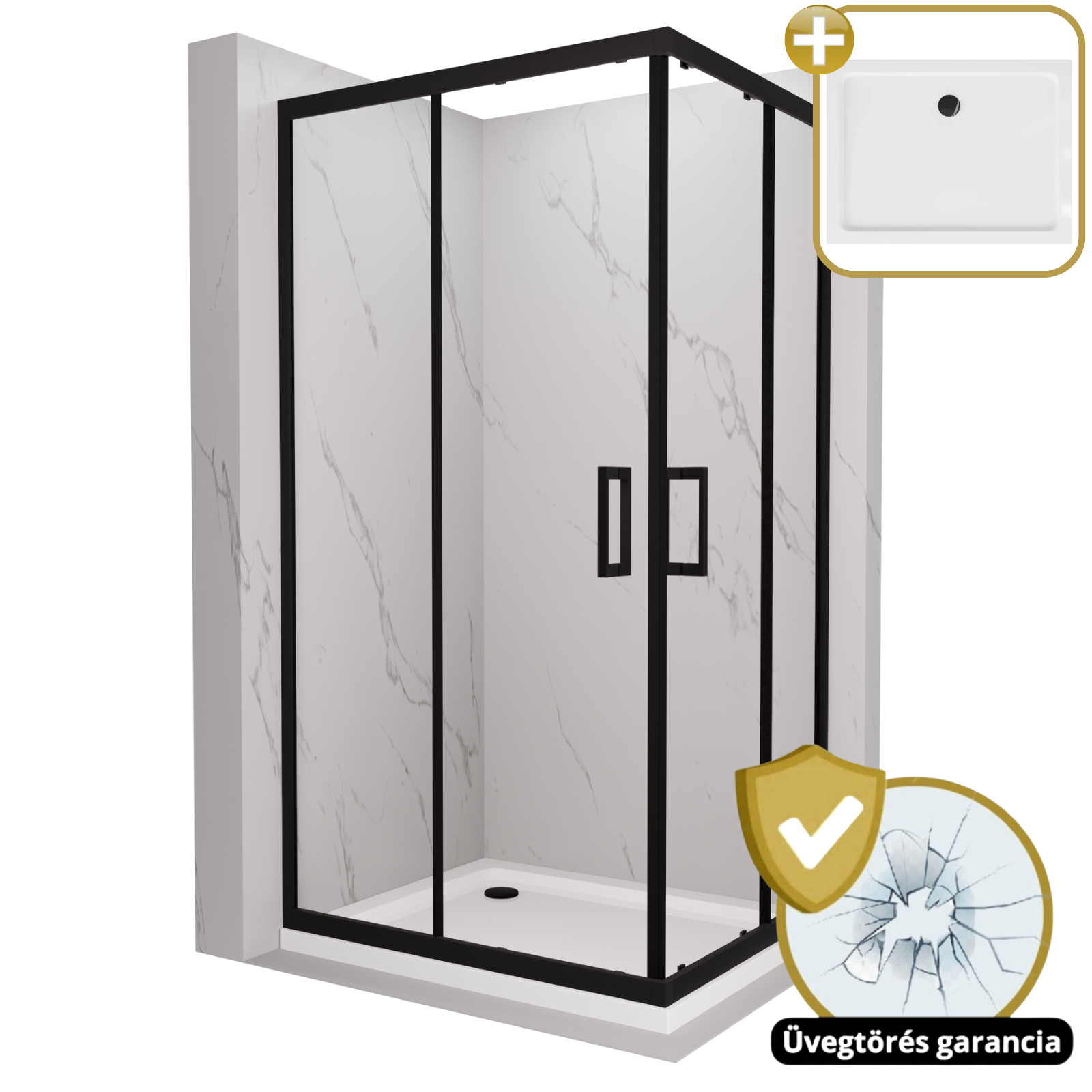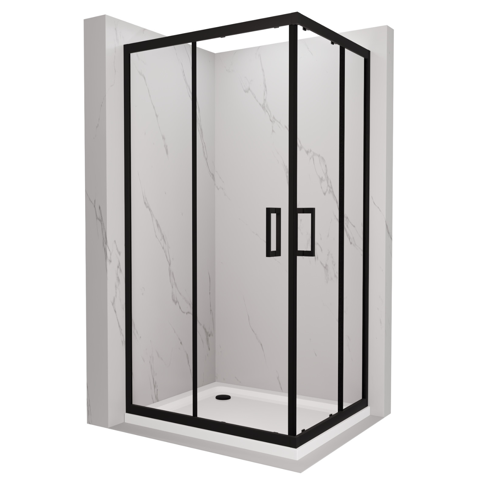 HD Elio 100x80 szögletes két tolóajtós zuhanykabin fehér slim zuhanytálcával és fekete szifonnal