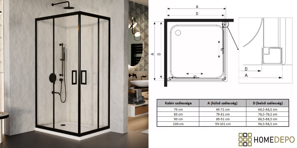 Napjainkban a praktikum mellett a fürdőszoba esztétikus megjelenése is fontos szempont. Az átlátszó üveges zuhanykabinok egyik előnye, hogy nem szűkitik össze a teret, elegáns, légies megjelenést kölcsönöznek a fürdőszobának. Az átlátszó üvegű zuhanykabinok a hagyományos és modern fürdőszobákban is megállják a helyüket. Az tolóajtónál az ajtónyílásból elvesznek az egymásra csúszó részek. Kisebb helyiségekben is kiváló megoldás lehet helytakarékosság szempontjából, mivel így nem kell arra figyeljen, hogy legyen elég hely az ajtó kinyitásához. A szögletes formával a rendelkezésre álló teret maximálisan ki lehet használni. Előnye, hogy zuhanyzáskor kényelmes, az íves formánál jelentősen nagyobb tér áll rendelkezésre. Saját márkás, Homedepo Elio, szögletes zuhanykabinunk, dupla görgőkkel érhető el, aminek köszönhetően jobban eloszlik a terhelés, egy ajtó 2 pont helyett 4 ponton gördül. Ez nagy mértékben biztosítja az egyenletesebb, simább működést és a hosszabb élettartamot. A görgők további fontos tulajdonságai közé sorolható, hogy Quick release systemmel ellátottak, aminek segítségével könnyedén fel- és leszerelhető a könnyedebb tisztítás érdekében.