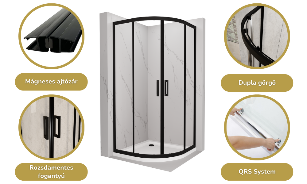 Az általunk legfontosabbnak vélt tulajdonságok íves zuhanykabinunknál: