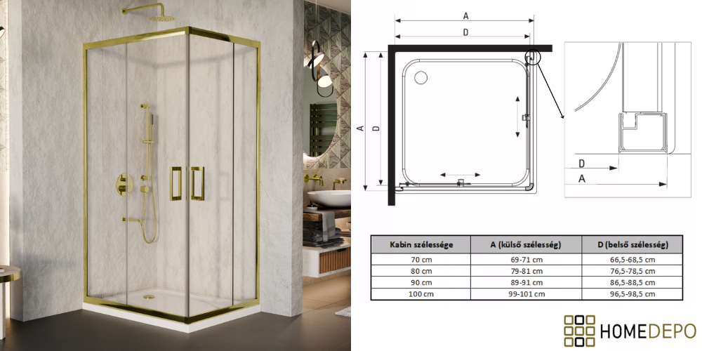 HD Elio Gold 90x100 szögletes két tolóajtós zuhanykabin fehér slim zuhanytálcával és arany szifonnal