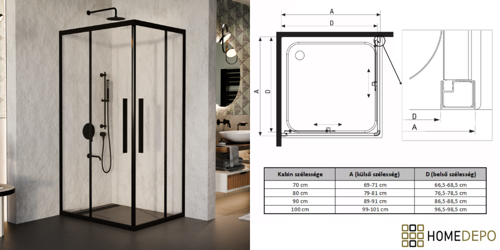 Napjainkban a praktikum mellett a fürdőszoba esztétikus megjelenése is fontos szempont. Az átlátszó üveges zuhanykabinok egyik előnye, hogy nem szűkitik össze a teret, elegáns, légies megjelenést kölcsönöznek a fürdőszobának. Az átlátszó üvegű zuhanykabinok a hagyományos és modern fürdőszobákban is megállják a helyüket. Az tolóajtónál az ajtónyílásból elvesznek az egymásra csúszó részek. Kisebb helyiségekben is kiváló megoldás lehet helytakarékosság szempontjából, mivel így nem kell arra figyeljen, hogy legyen elég hely az ajtó kinyitásához. A szögletes formával a rendelkezésre álló teret maximálisan ki lehet használni. Előnye, hogy zuhanyzáskor kényelmes, az íves formánál jelentősen nagyobb tér áll rendelkezésre. Saját márkás, Homedepo Elio, szögletes zuhanykabinunk, dupla görgőkkel érhető el, aminek köszönhetően jobban eloszlik a terhelés, egy ajtó 2 pont helyett 4 ponton gördül. Ez nagy mértékben biztosítja az egyenletesebb, simább működést és a hosszabb élettartamot. A görgők további fontos tulajdonságai közé sorolható, hogy Quick release systemmel ellátottak, aminek segítségével könnyedén fel- és leszerelhető a könnyedebb tisztítás érdekében.