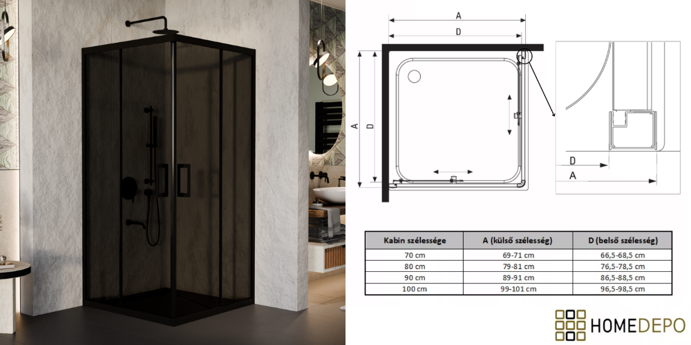 Napjainkban a praktikum mellett a fürdőszoba esztétikus megjelenése is fontos szempont. Az átlátszó üveges zuhanykabinok egyik előnye, hogy nem szűkitik össze a teret, elegáns, légies megjelenést kölcsönöznek a fürdőszobának. Az átlátszó üvegű zuhanykabinok a hagyományos és modern fürdőszobákban is megállják a helyüket. Az tolóajtónál az ajtónyílásból elvesznek az egymásra csúszó részek. Kisebb helyiségekben is kiváló megoldás lehet helytakarékosság szempontjából, mivel így nem kell arra figyeljen, hogy legyen elég hely az ajtó kinyitásához. A szögletes formával a rendelkezésre álló teret maximálisan ki lehet használni. Előnye, hogy zuhanyzáskor kényelmes, az íves formánál jelentősen nagyobb tér áll rendelkezésre. Saját márkás, Homedepo Fusion, szögletes zuhanykabinunk, dupla görgőkkel érhető el, aminek köszönhetően jobban eloszlik a terhelés, egy ajtó 2 pont helyett 4 ponton gördül. Ez nagy mértékben biztosítja az egyenletesebb, simább működést és a hosszabb élettartamot. A görgők további fontos tulajdonságai közé sorolható, hogy Quick release systemmel ellátottak, aminek segítségével könnyedén fel- és leszerelhető a könnyedebb tisztítás érdekében.