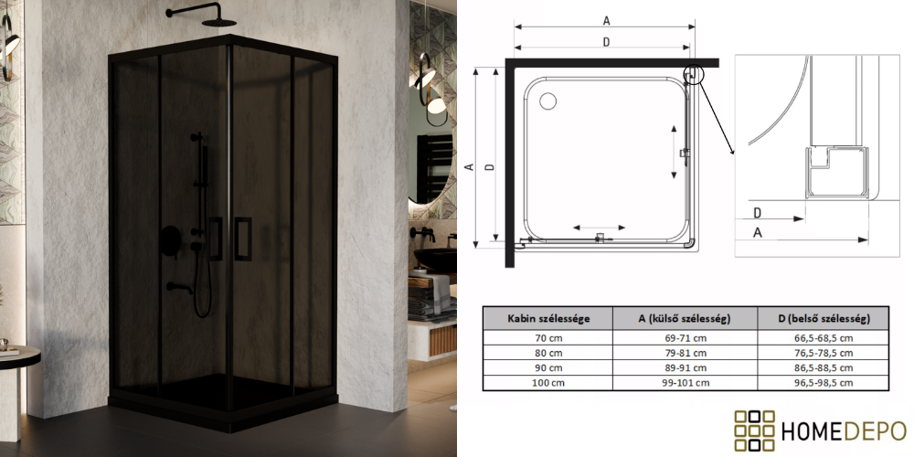 Napjainkban a praktikum mellett a fürdőszoba esztétikus megjelenése is fontos szempont. Az átlátszó üveges zuhanykabinok egyik előnye, hogy nem szűkitik össze a teret, elegáns, légies megjelenést kölcsönöznek a fürdőszobának. Az átlátszó üvegű zuhanykabinok a hagyományos és modern fürdőszobákban is megállják a helyüket. Az tolóajtónál az ajtónyílásból elvesznek az egymásra csúszó részek. Kisebb helyiségekben is kiváló megoldás lehet helytakarékosság szempontjából, mivel így nem kell arra figyeljen, hogy legyen elég hely az ajtó kinyitásához. A szögletes formával a rendelkezésre álló teret maximálisan ki lehet használni. Előnye, hogy zuhanyzáskor kényelmes, az íves formánál jelentősen nagyobb tér áll rendelkezésre. Saját márkás, Homedepo Fusion, szögletes zuhanykabinunk, dupla görgőkkel érhető el, aminek köszönhetően jobban eloszlik a terhelés, egy ajtó 2 pont helyett 4 ponton gördül. Ez nagy mértékben biztosítja az egyenletesebb, simább működést és a hosszabb élettartamot. A görgők további fontos tulajdonságai közé sorolható, hogy Quick release systemmel ellátottak, aminek segítségével könnyedén fel- és leszerelhető a könnyedebb tisztítás érdekében.