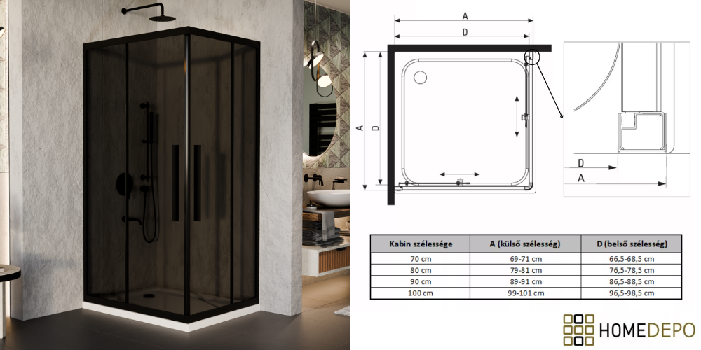 Napjainkban a praktikum mellett a fürdőszoba esztétikus megjelenése is fontos szempont. Az átlátszó üveges zuhanykabinok egyik előnye, hogy nem szűkitik össze a teret, elegáns, légies megjelenést kölcsönöznek a fürdőszobának. Az átlátszó üvegű zuhanykabinok a hagyományos és modern fürdőszobákban is megállják a helyüket. Az tolóajtónál az ajtónyílásból elvesznek az egymásra csúszó részek. Kisebb helyiségekben is kiváló megoldás lehet helytakarékosság szempontjából, mivel így nem kell arra figyeljen, hogy legyen elég hely az ajtó kinyitásához. A szögletes formával a rendelkezésre álló teret maximálisan ki lehet használni. Előnye, hogy zuhanyzáskor kényelmes, az íves formánál jelentősen nagyobb tér áll rendelkezésre. Saját márkás, Homedepo Elio, szögletes zuhanykabinunk, dupla görgőkkel érhető el, aminek köszönhetően jobban eloszlik a terhelés, egy ajtó 2 pont helyett 4 ponton gördül. Ez nagy mértékben biztosítja az egyenletesebb, simább működést és a hosszabb élettartamot. A görgők további fontos tulajdonságai közé sorolható, hogy Quick release systemmel ellátottak, aminek segítségével könnyedén fel- és leszerelhető a könnyedebb tisztítás érdekében.
